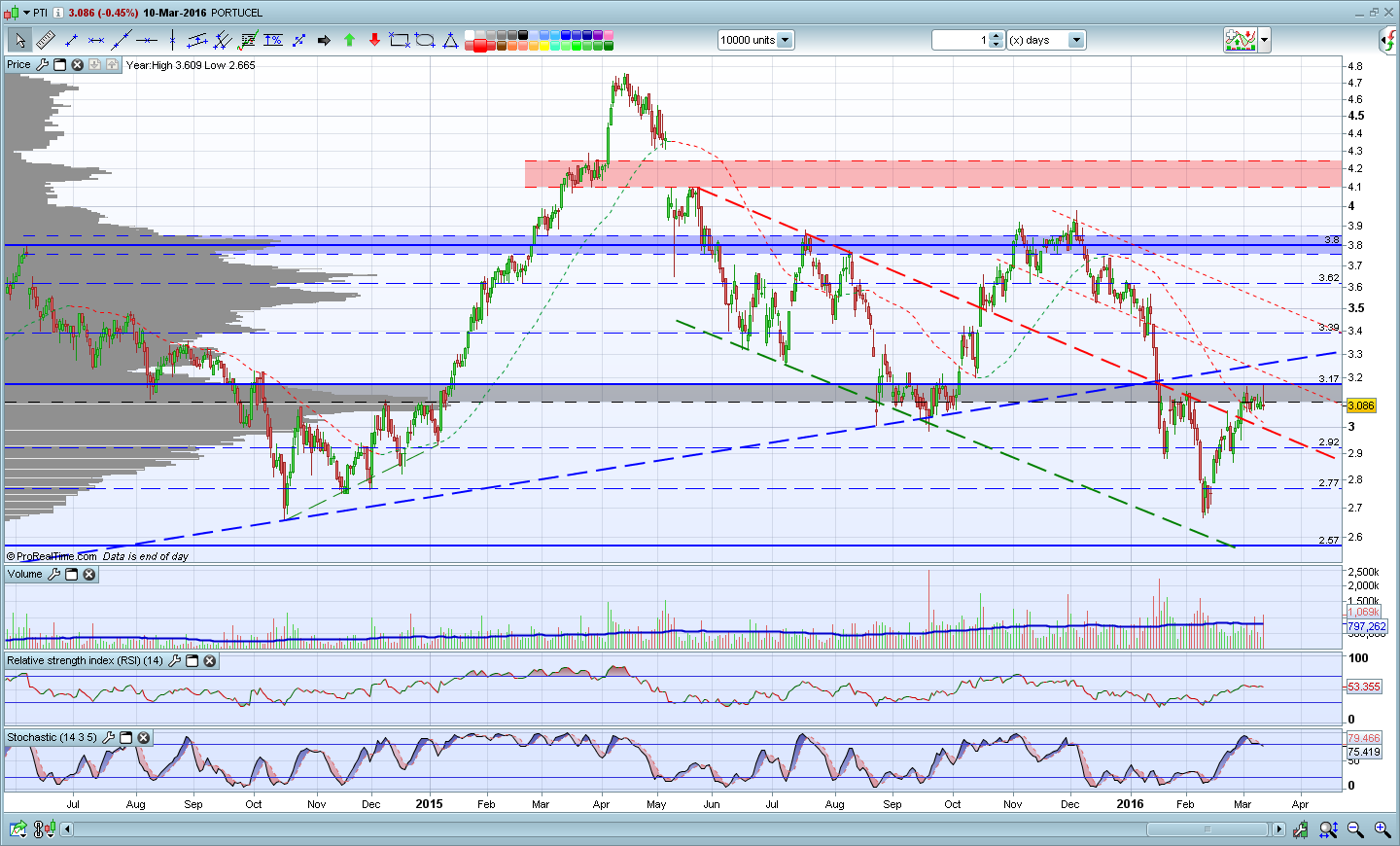 Pelos gráficos aqui colocados, daquilo que entendo de AT a Portucel a cotar nos 3 euros, tem duas grandes resistências, entre os 3,15 e os 3,25 e entre os 3,80 e os 3,90. Mas primeiro precisa de lá chegar...
