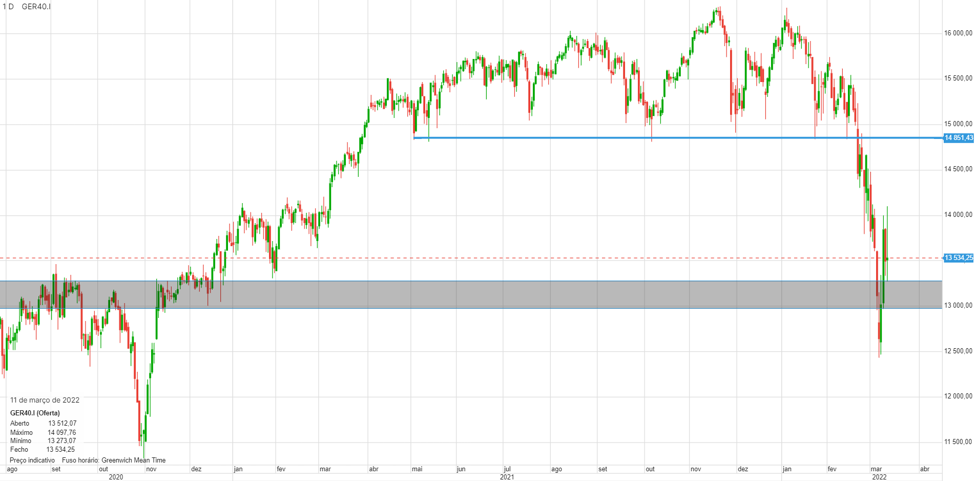 Este é o 3º toque na zona dos 13000, que foi onde o indice andou desde 2017. No Dax, prognósticos só no fim do jogo.