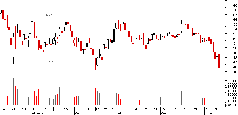 rsacramento, em minha opinião o range de lateralização é entre os 49 e os 55,5 (a ida aos 45 foi uma falsa ruptura em baixa). Seja como for, enquanto não furar os 55,5 é melhor aguardar. Não há pressa.