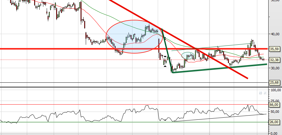 Caso consiga ultrapassar consistentemente essa linha de resistência entrarei de novo, ou se reagir negativamente à linha e vier novamente ao patamar dos $34.