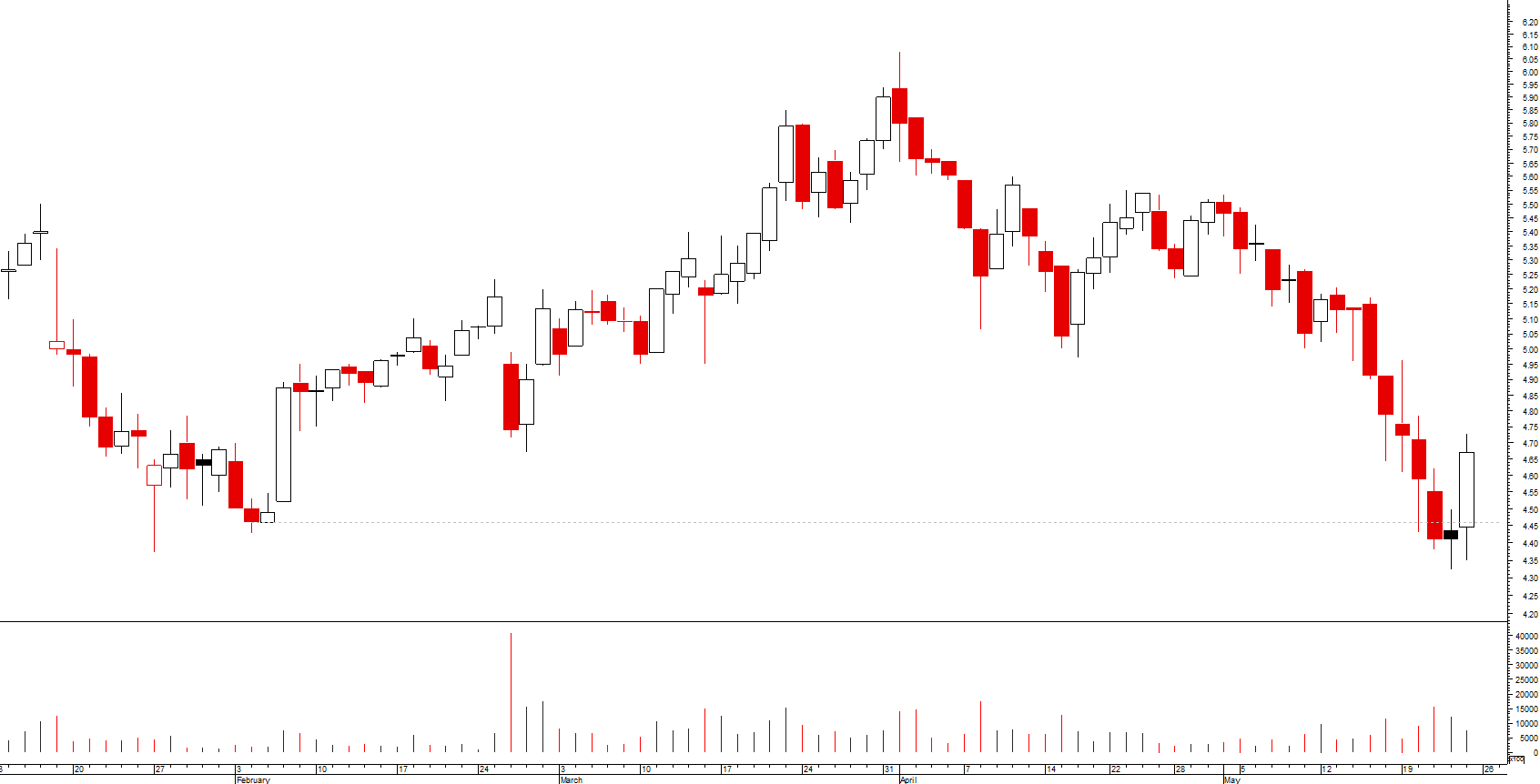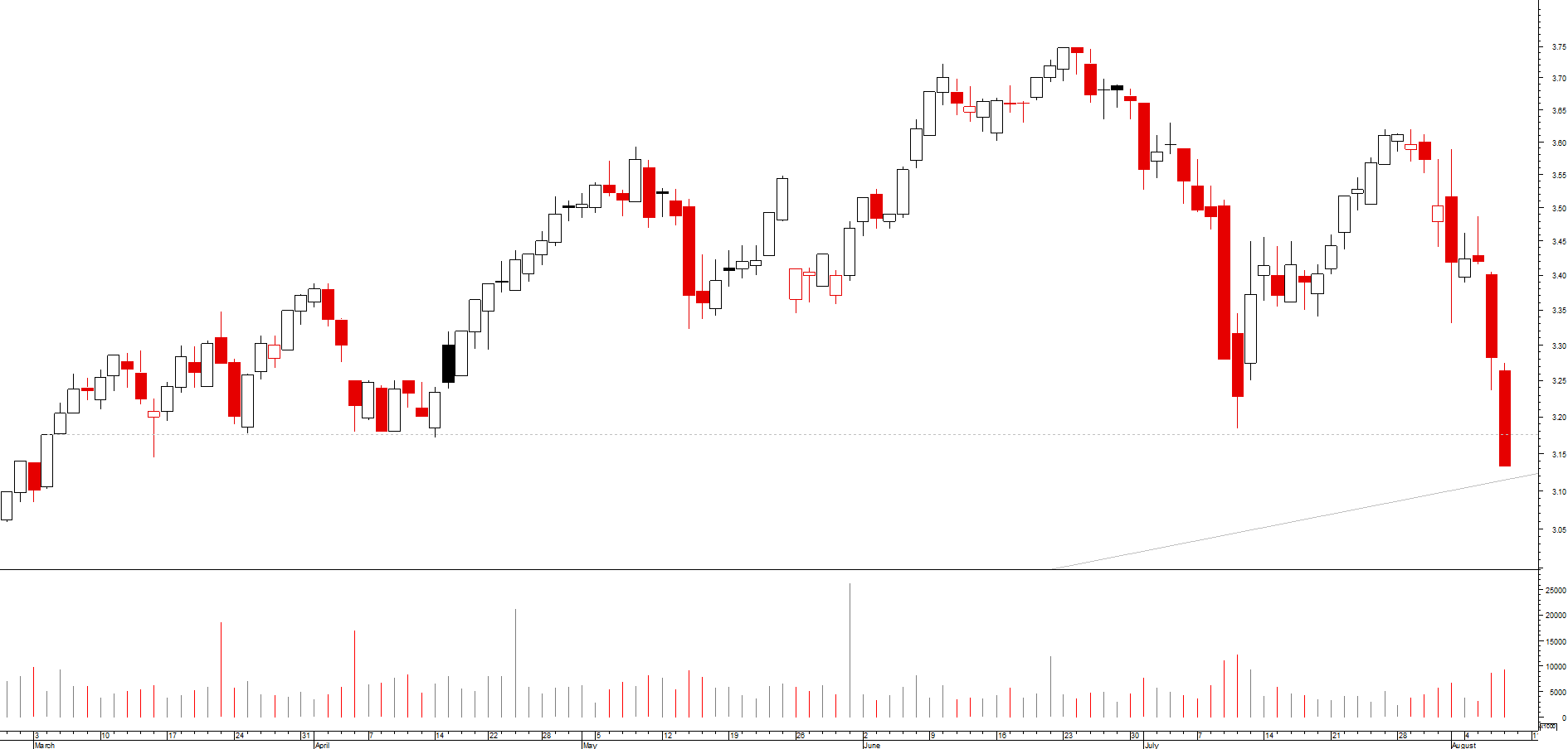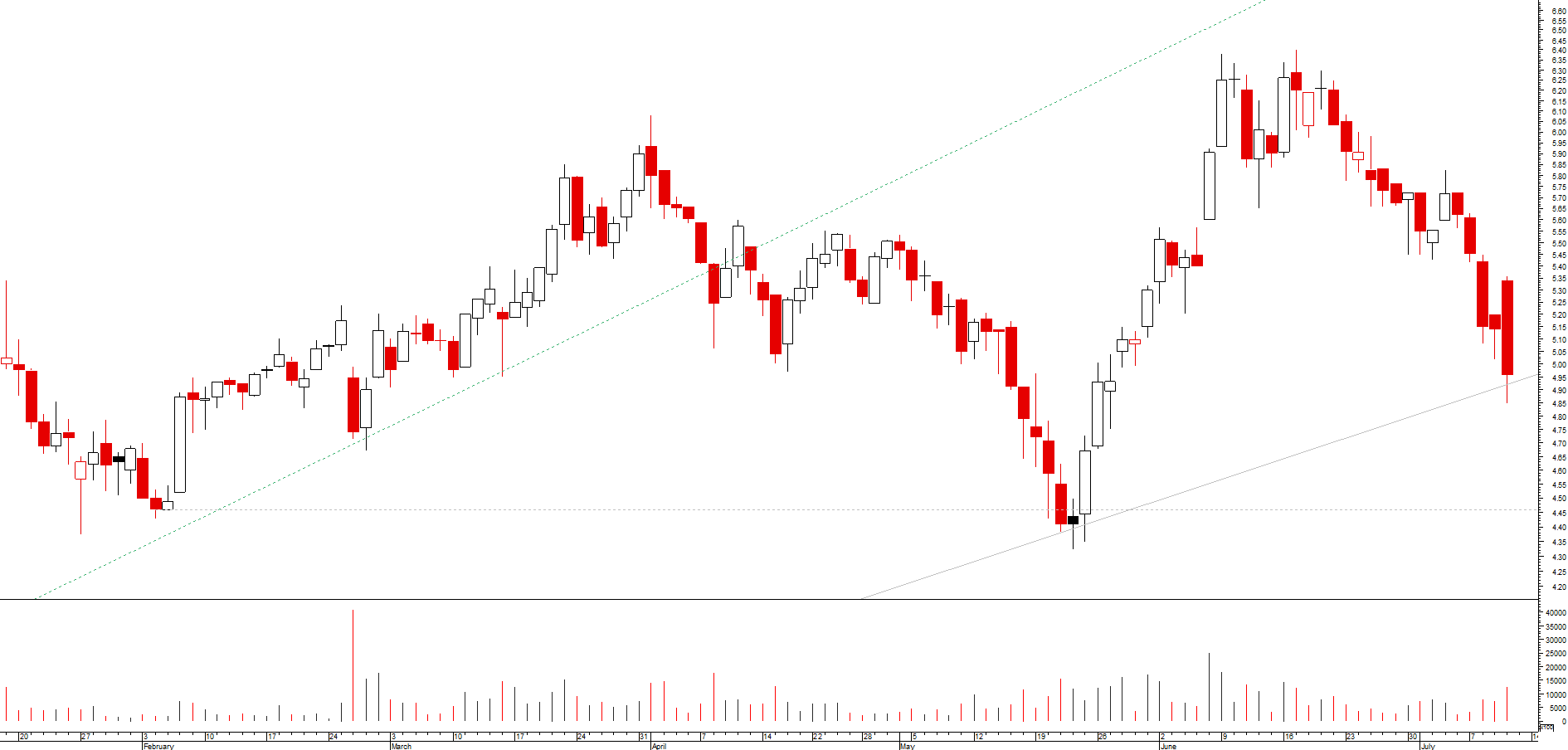 se, por um lado, desde o máximo de março, se assiste a uma toada de fundos e altos sucessivamente mais baixos, o que revela uma tendência descendente, ainda que secundária, por outro lado a cotada encontra-se momentaneamente sobre um suporte local e acabou de desenhar um padrão de velas de inversão da tendência de curto prazo (martelo)