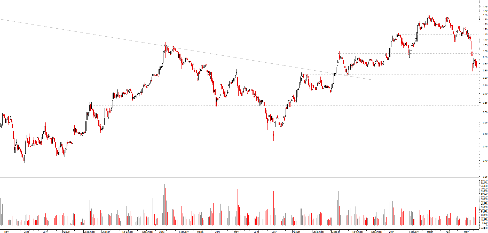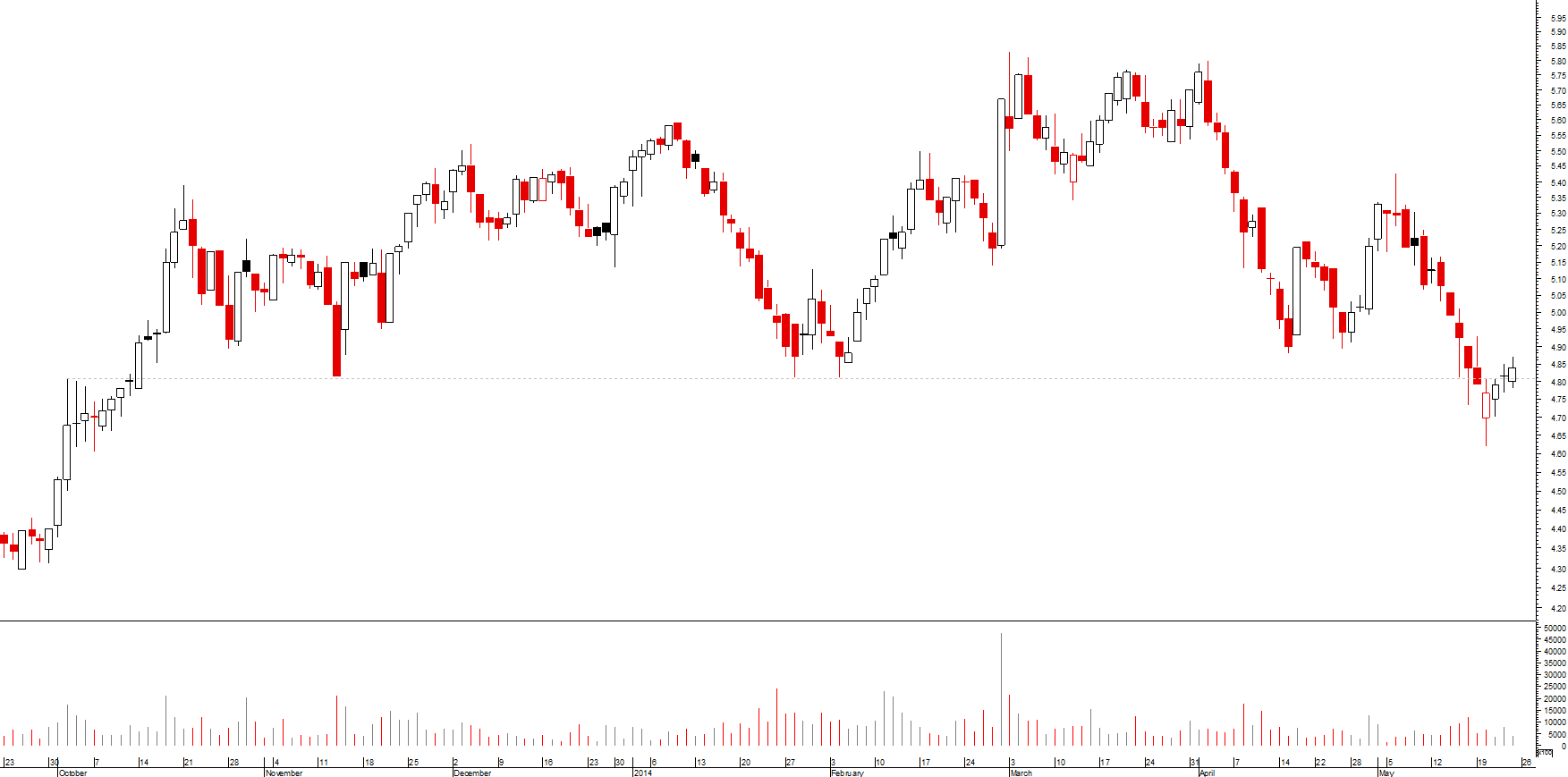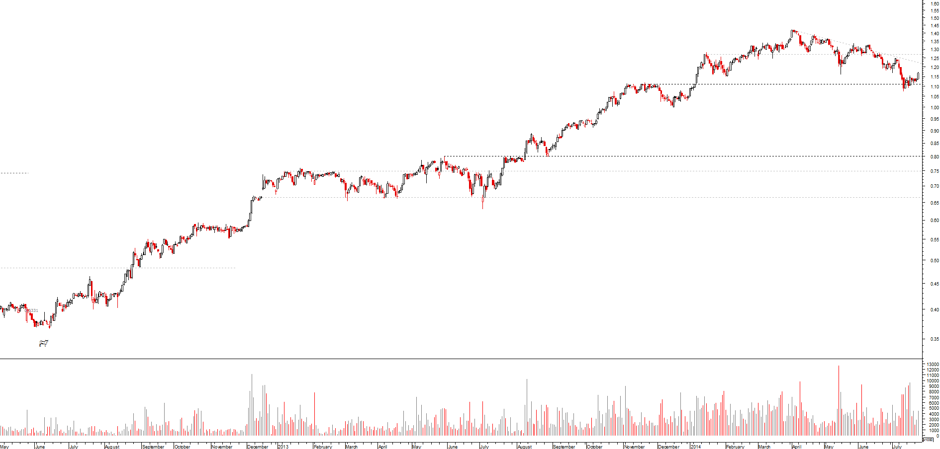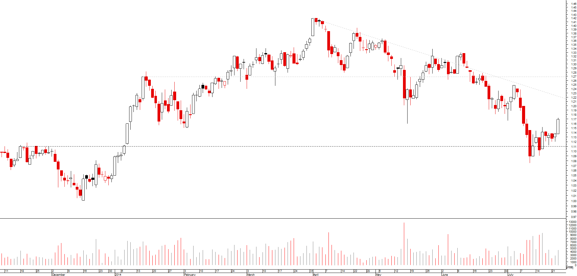 se, por um lado, desde o máximo de março, se assiste a uma toada de fundos e altos sucessivamente mais baixos, o que revela uma tendência descendente, ainda que secundária, por outro lado a cotada encontra-se momentaneamente sobre um suporte local e acabou de desenhar um padrão de velas de inversão da tendência de curto prazo (martelo)