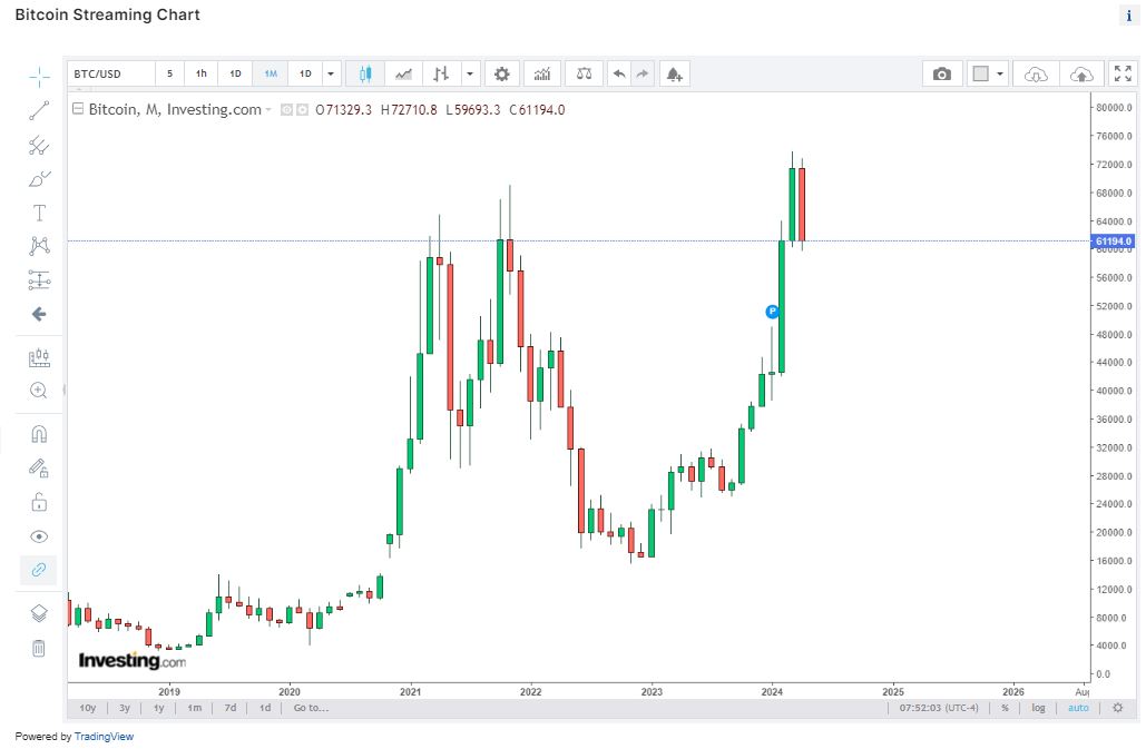 O gráfico mensal da Bitcoin faz swings perfeitos para cima ou para baixo
