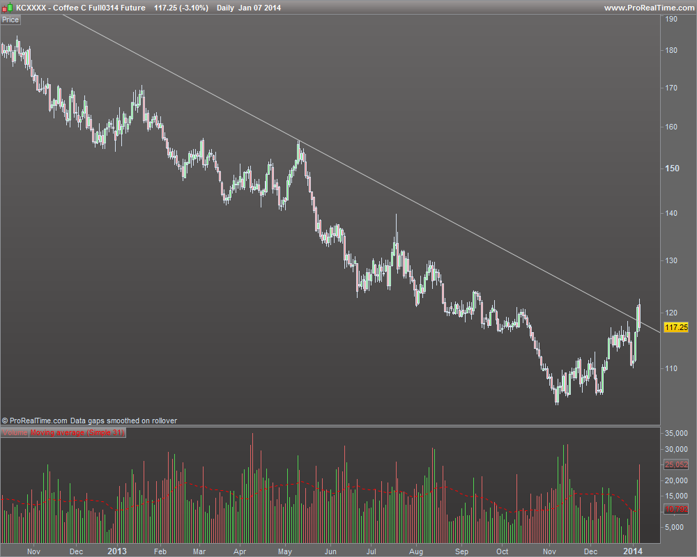 O café encontra-se num bear market profundo, desde o pico de 2011 perdeu dois terços do seu valor.