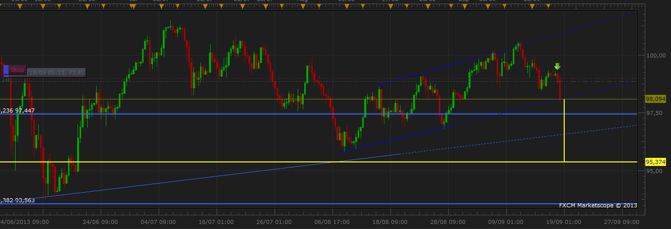 O Usd Index acabou por reagir ao suporte de curto prazo - 10.650pts - e, caso resolva fazer um upswing, implica que pares como o euro, aussie, cable, kiwi, venham por aí abaixo. No entanto, e para já, não estou à espera de uma reacção forte já que o mercado parece estar a acusar alguma ansiedade sobre a dimensão do possível tappering da FED.