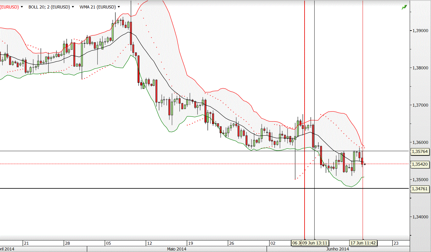 Todavia, considerando que a tendência mãe é descendente, por ora, optou-se por retirar o lucro do trade numa zona onde frequentemente acontecem retracções (banda bollinger superior).