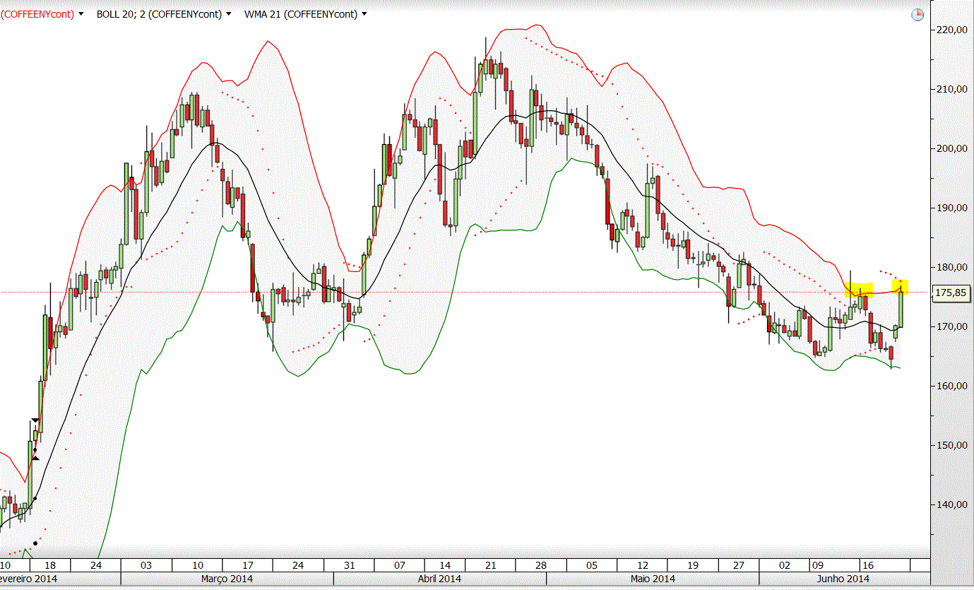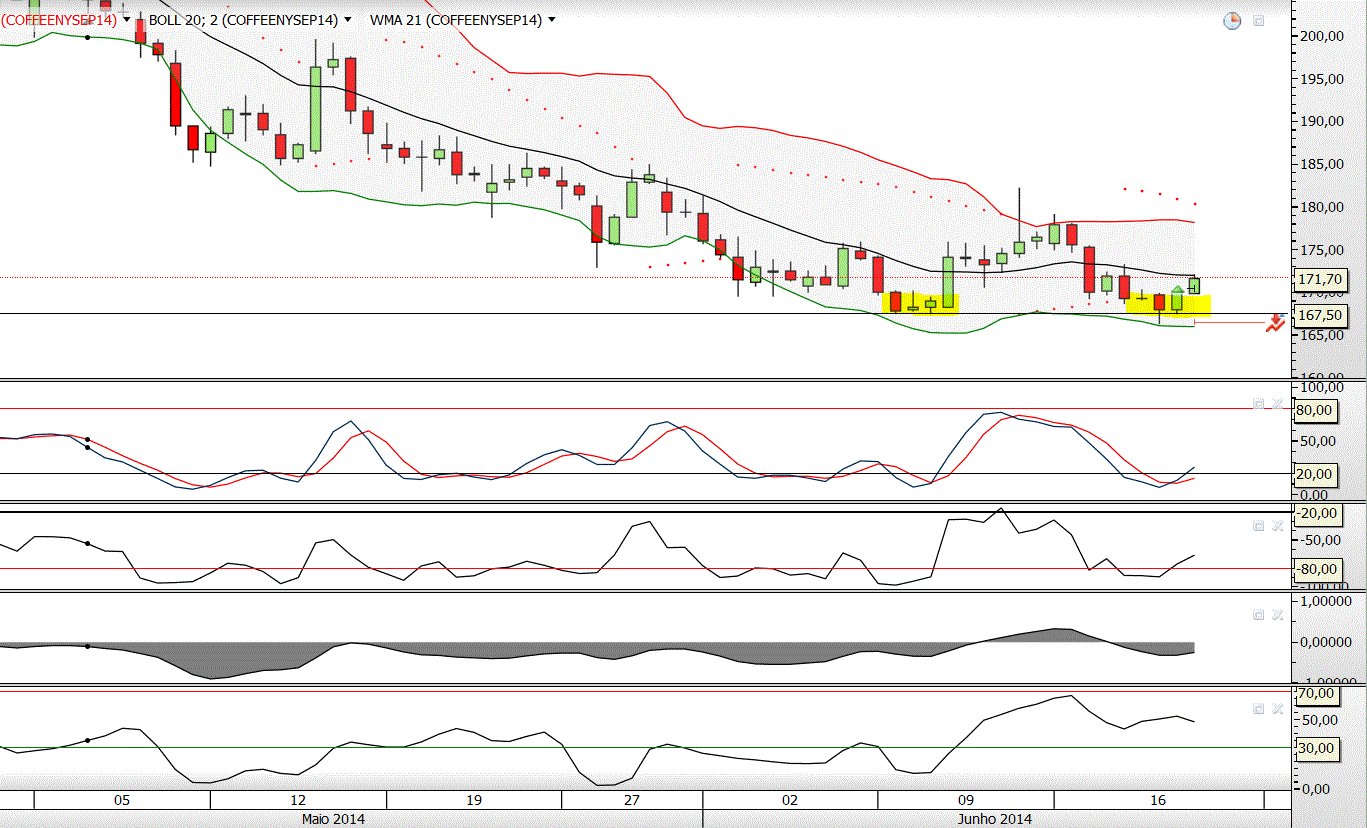É possível aferir, no primeiro gráfico abaixo, que a tendência de médio prazo do café é descendente em virtude de o activo ter vindo a fazer sucessivos máximos e mínimos cada vez mais baixos.