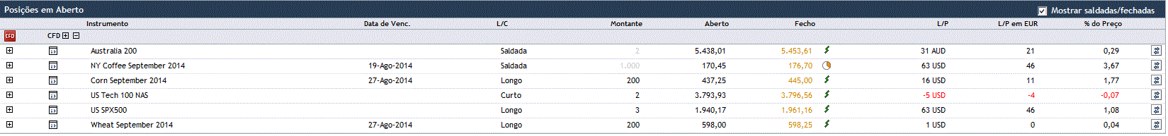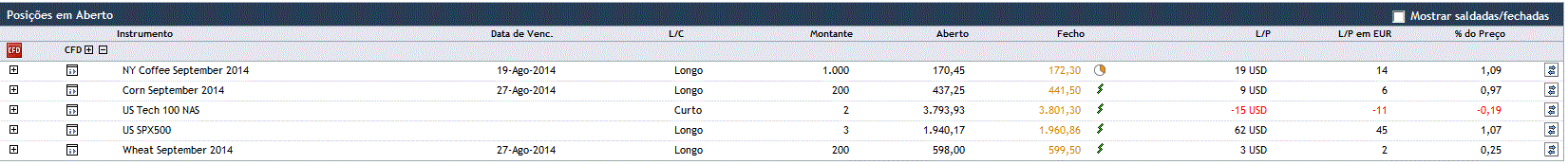 Carteira actual com as recentes posições saldadas (índice australiano e mercadoria - coffee), bem como com as posições que continuam abertas: