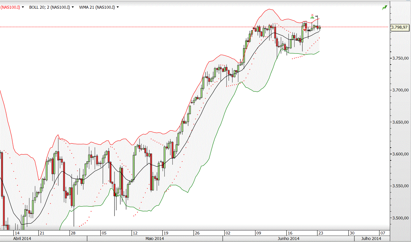 Entrar quando a 2ª vela verde já ia muito adiantada já comportou alguns riscos, face à proximidade da Banda Bollinger superior.