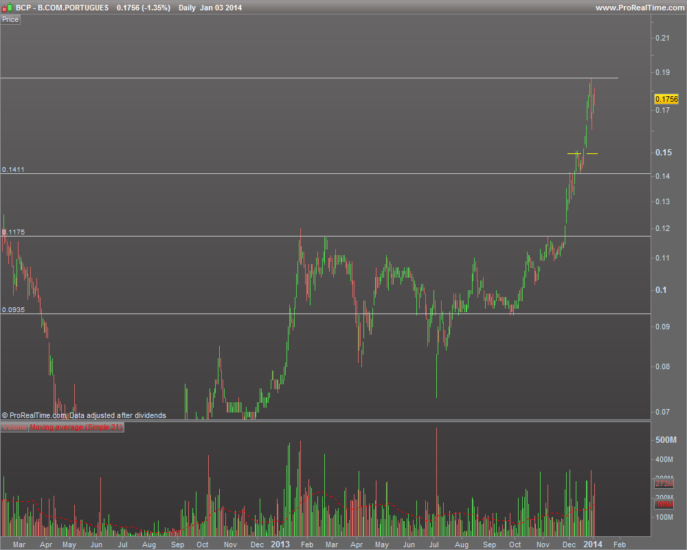 Os últimos anos foram o que se sabe. Se tivesse que apostar na ação mais falada no CdB nos últimos 5 anos, apostava sem dúvida nesta (e se tivesse que apostar na que é capaz de gerar mais fanatismo seria esta também). Apesar de já a ter negociado em 2009, desde aí que se tornou desinteressante para mim, até muito recentemente, com os primeiros sinais de inversão a aparecerem nos finais de Novembro, com os máximos do ano (quebra dos ~0.118, assinalados nos gráficos). Com a força demonstrada a partir daí - já esteve a ganhar perto de 60% desde essa altura - e já que teimou em nunca mais ter uma correção que se visse, acabei por entrar na mini-correção à zona dos 0,14 e alguns dias depois, uma vez que estava satisfeito o requisito de ter um stop acima da entrada, reforcei na mini-correção de final de ano. Neste momento e dada a ausência de melhor referência nas proximidades, o meu stop (para ambas as posições) está nos 0.1498, anteriores máximos relativos. O stop está representado a amarelo tracejado nos gráficos.
