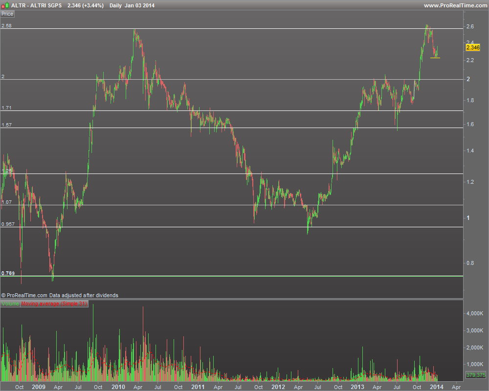 A Altri é uma ação que tem por hábito arrancar violentamente. Já a tinha acompanhado desde o final de 2012, em mais um desses arranques (70% em meio ano!) abandonando-a naquilo que agora reconheço ter sido o período de consolidação de 2013, entre os 1,7 e os 2€. Fiquei a aguardar a quebra dos 2€ como sinal para entrar novamente, mas nova tirada de 30% com velas vermelhas que se contam pelos dedos de uma mão inviabilizaram a entrada. A ação corrigiu agora cerca de 50% destas subidas e acabou por estabilizar, aparentemente na zona dos 2,2x. A vela de sexta-feira sugere inversão no muito curto prazo prazo e escaldado pelo último movimento prefiro arriscar a entrada na segunda-feira do que ficar à espera de uma correção que pode nunca vir.