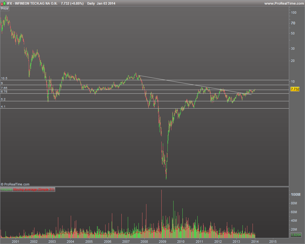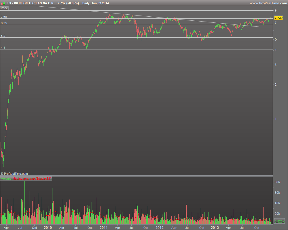 A Infineon tem uma fatia de leão da carteira. Este papel teve um um comportamento atípico no final de 2011 princípios de 2012, quando a generalidade das cotadas faziam mínimos, aguentando-se numa longa lateralização entre os 5,x e os 8,x euros, o que só por si indica alguma força relativa. O fim confirmado desta lateralização será a quebra em alta dos 8,3, máximos deste período. Para já, depois de ter quebrado a resistência dos 6,75 a IFX debate-se com os 7,65 estando para já a mostrar uma boa reação à quebra marginal do final de ano.