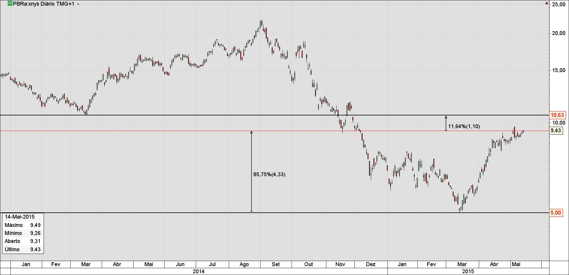 Após a divulgação de resultados hoje da PBR os Adrs no NYSE disparam em afther-market já com 5% de avanços. Há gap-up como antigamente, já tocando o ultimo fundo de março de 2014 que fez uma incrível subida de 106% em seis meses. Já recuperou 87% em pouco mais de 60 dias o ultimo toque ao novo fundo de 5usd em março de 2015, a PBR segue firme e forte e contamina com otimismo todos os índices do IBOVESPA. Pessoalmente a minha estratégia tática e objetiva é e de apenas o daytrade, aqui no IBOVESPA ou qualquer outra Bolsa de Valores, definido está a não montar posições longas puro e simplesmente por autodeterminação com e excetuando uma posição longa da OIBR adr NYSE e um miminho na PBR e na tão esperada consolidação do setor das telecomunicações do Brasil e na América Latina, inevitável consequência da expansão económica brasileira neste área geográfica e estratégica .