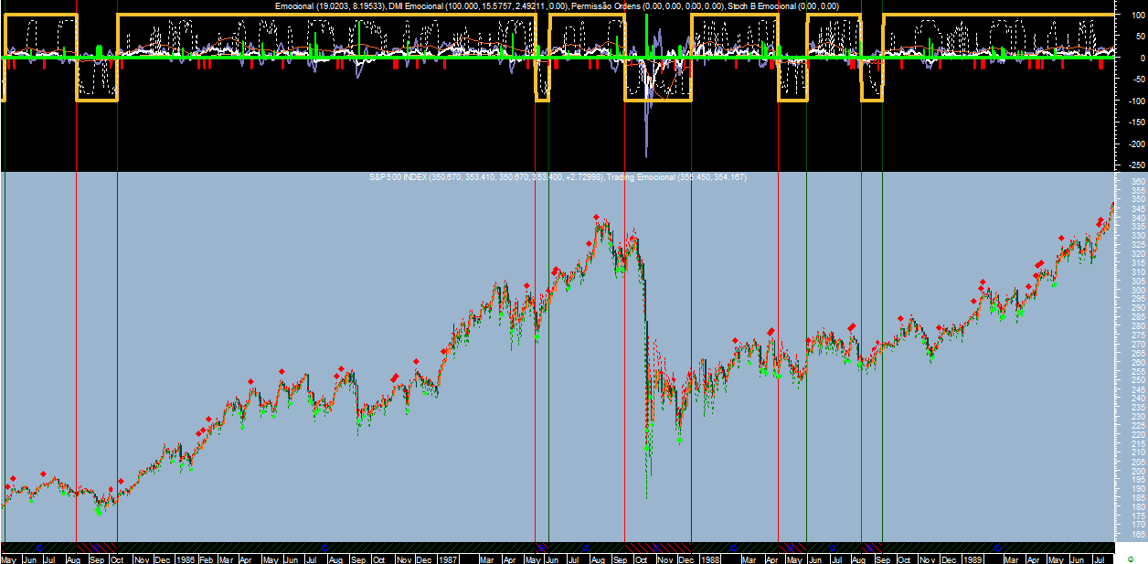 Como podes verificar o crash ocorreu em Outubro de 1987 mas o sistema diário daria sinal de venda no dia 22 de setembro de 1987 aos 311 pontos (passagem a neutro) e só voltaria a reentrar com compras (posição longa) em 22 de dezembro desse mesmo ano aos 250 pontos.