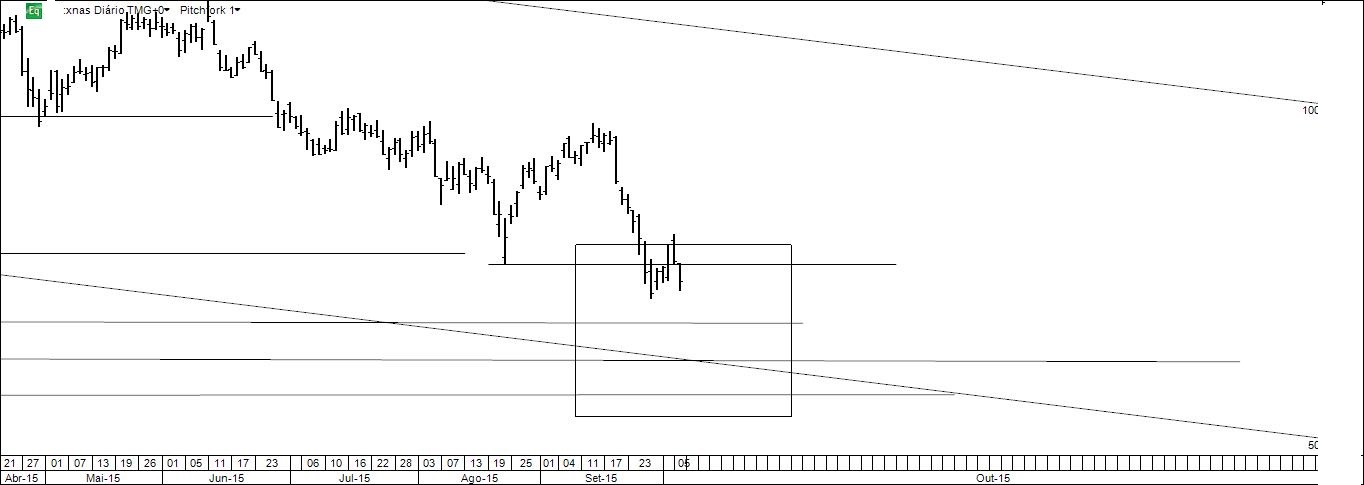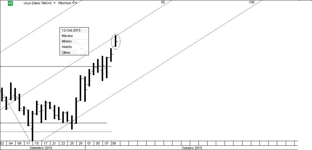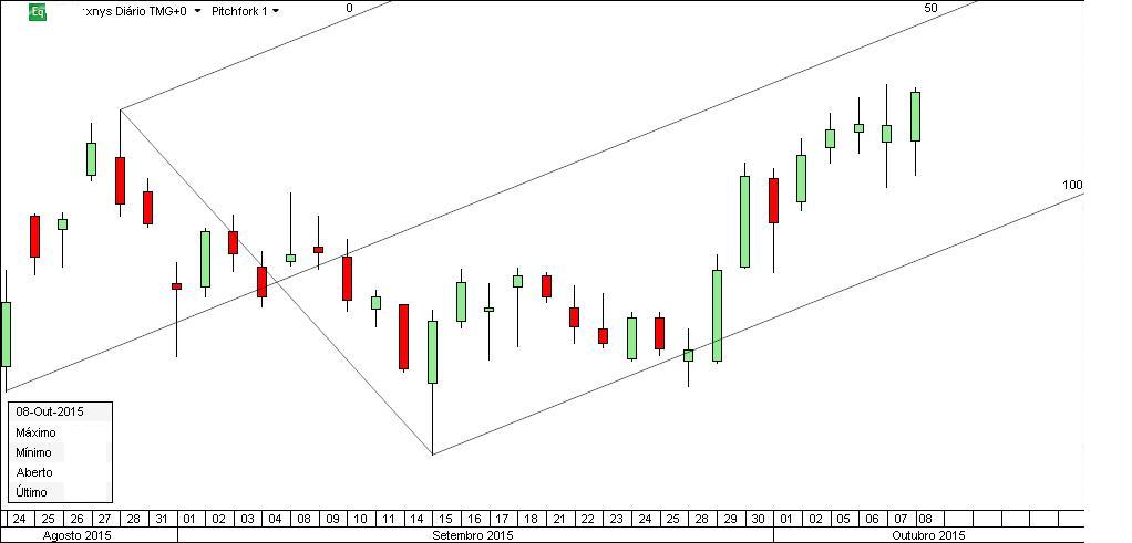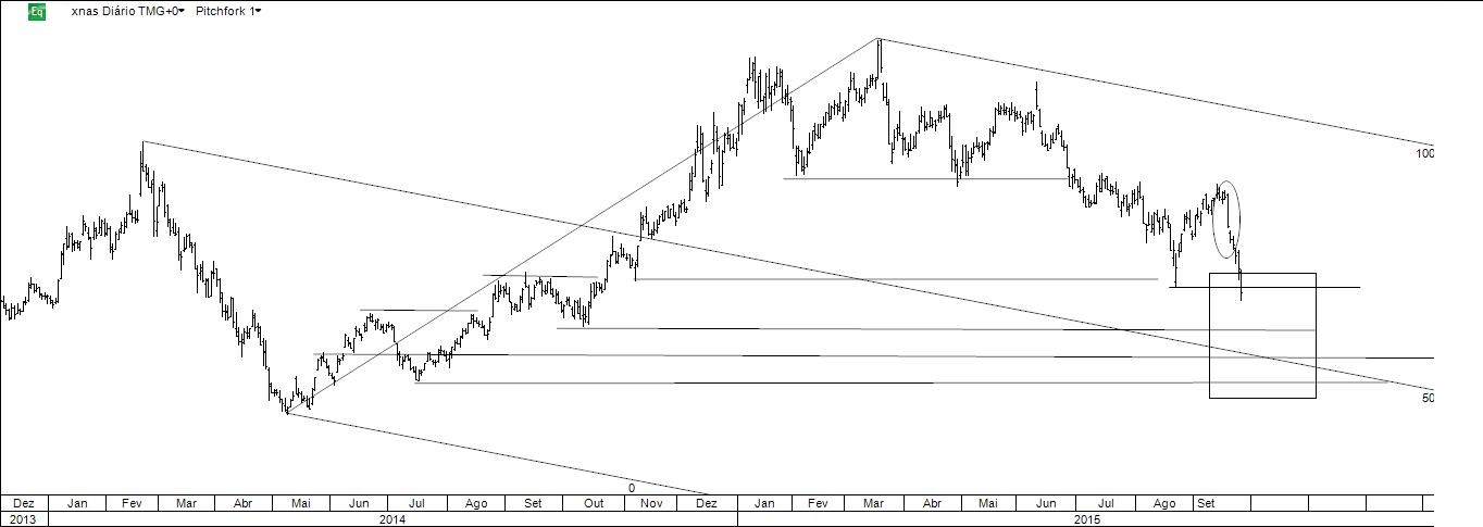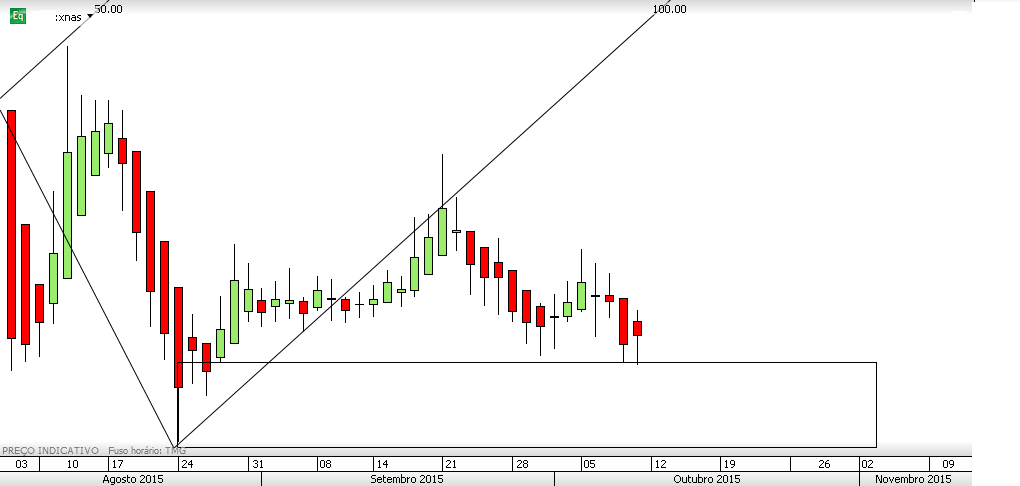 HAS: um dos negócios realizados no âmbito do FIA15. O gráfico que segue é igual ao último aqui colocado. As linhas são as mesmas, a cotação é que variou. Houve total liberdade para um acompanhamento do título a partir de então. Quem o fez pôde constatar a presença de um sinal. Se a ele não fechou os olhos e alma, terá realizado a "compra verde". Bastava ter imprimido o gráfico e colá-lo na parede à espera que a tinta secasse.