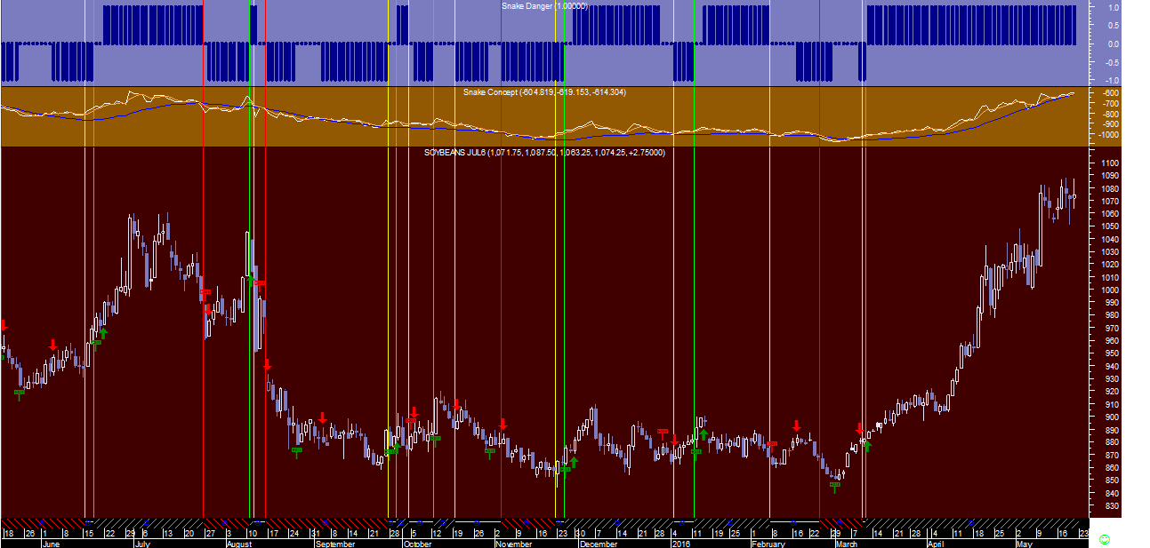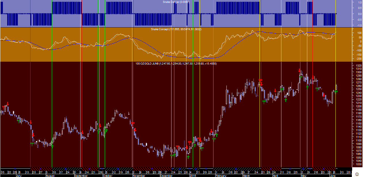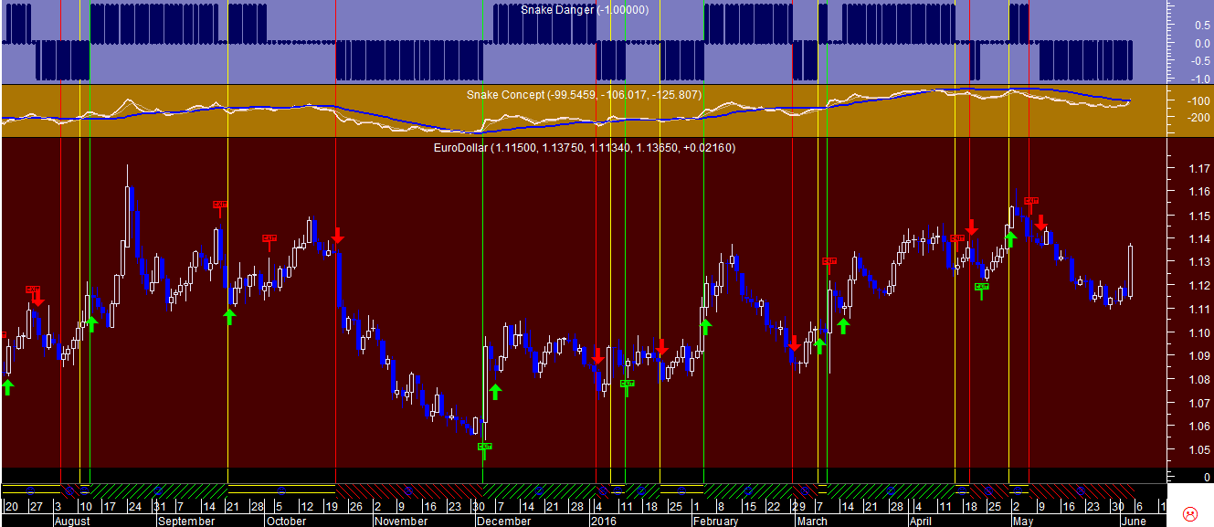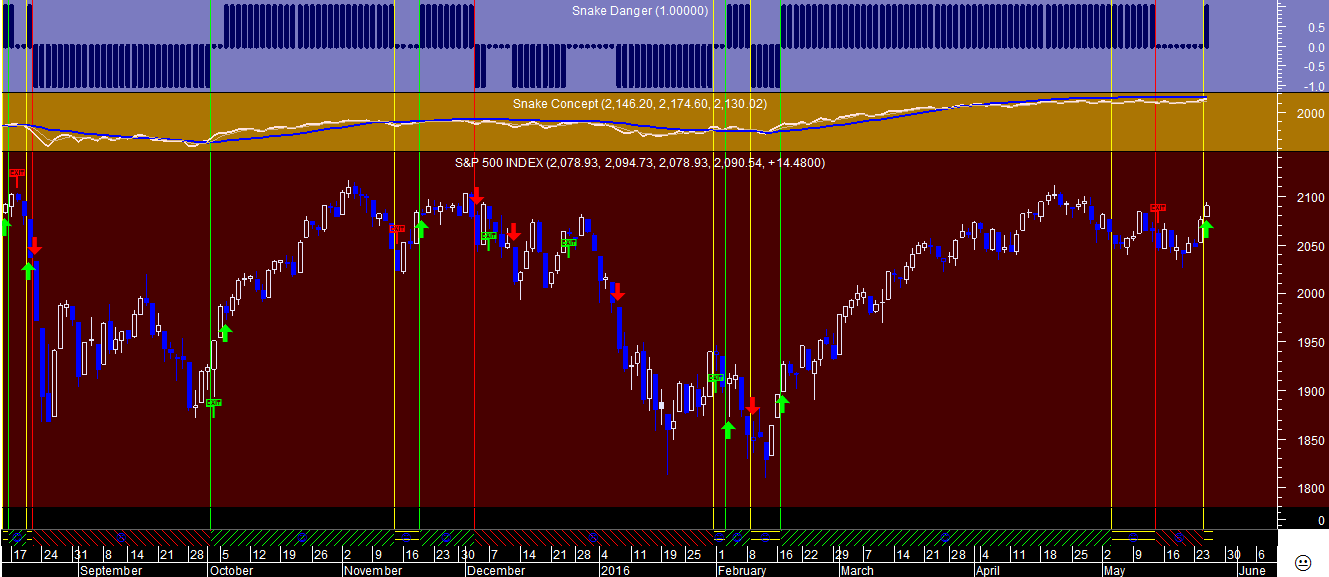 Se olharem para o gráfico do meio, que representa os indicadores críticos do sistema de trading, face ao facto da linha branca do caminho da “Cobra” ter passado acima da linha azul, que seria o caminho previsto das cotações ou da “Cobra” calculado pelo programa, será de esperar um disparo a muito curto prazo de um sinal de venda quando o indicador branco virar o seu sentido para baixo. Vai ser interessante!