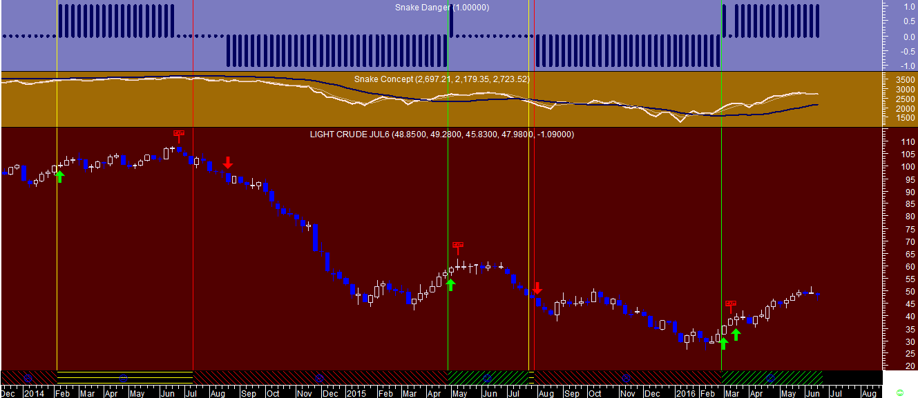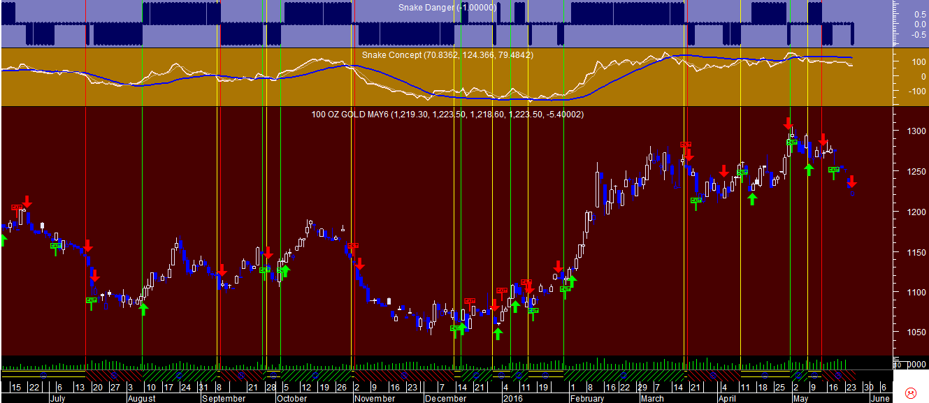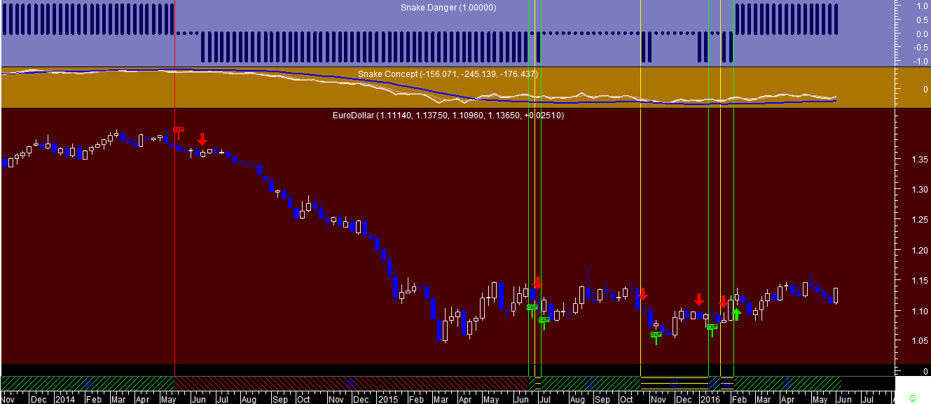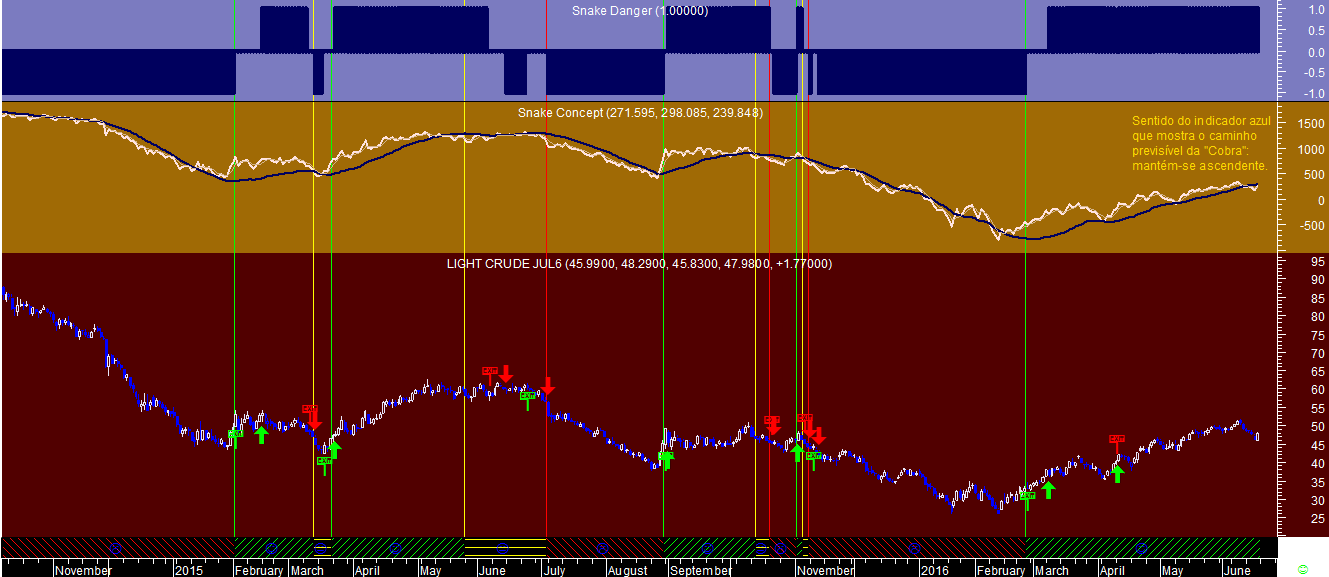 Ficam em anexo os sinais da “Cobra” no gráfico diário onde se pode detetar que, apesar do sinal continuar virado para cima, apareceu nesta semana no dia 24 de maio uma alteração de um regime tendencial ascendente para lateral, através da visualização da linha vertical amarela no gráfico.