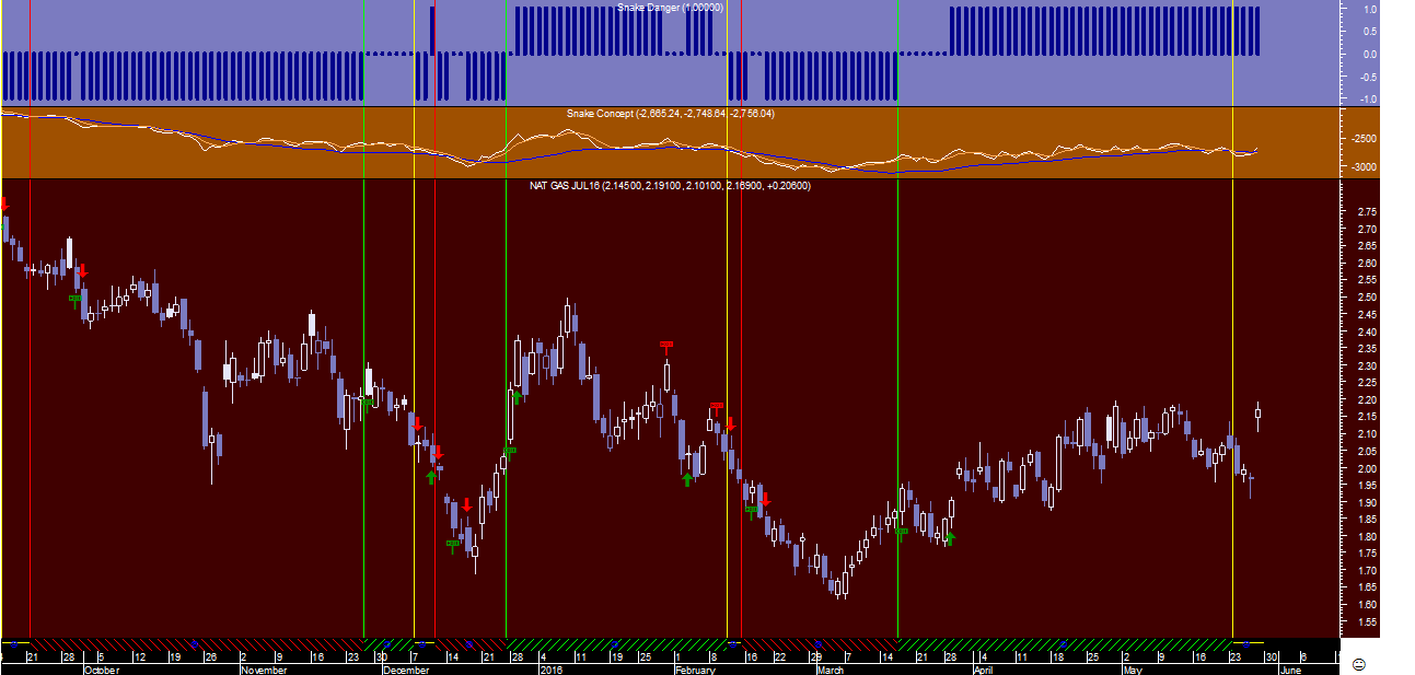 O caso do Gás Natural, como tinha previsto na 6ª feira, é um exemplo muito curioso deste sistema de trading pois apesar dos futuros do GN terem disparado hoje no final da sessão mais de 5%, o sistema “Cobra” acabou mesmo assim de assinalar um sinal de venda (!) na escala diária pelo facto de considerar no âmbito do programa que se encontra junto ao topo dum canal mais ou menos horizontal num regime de comportamento lateralizado, o que significa, face ao sinal comprado na semanal, que acabou de dar um sinal de saída para neutro nesta “commodity” energética.