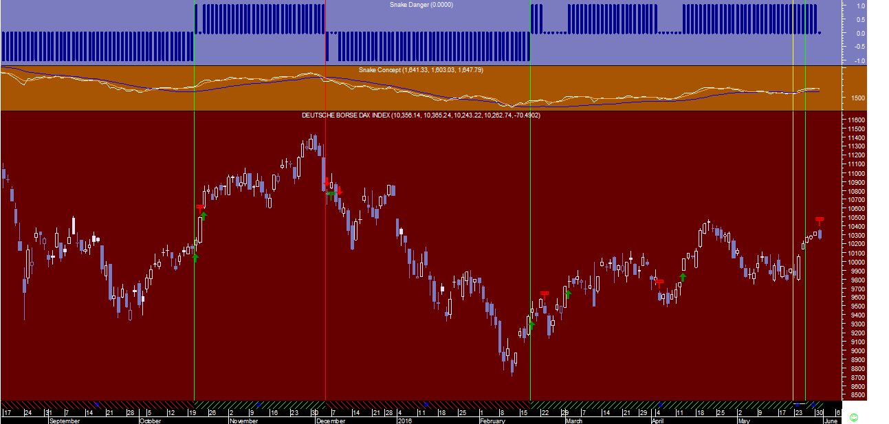 A sessão de hoje marca também outra viragem no posicionamento da “Cobra” no DAX, uma vez que no gráfico diário o sinal passou de comprado a neutro.