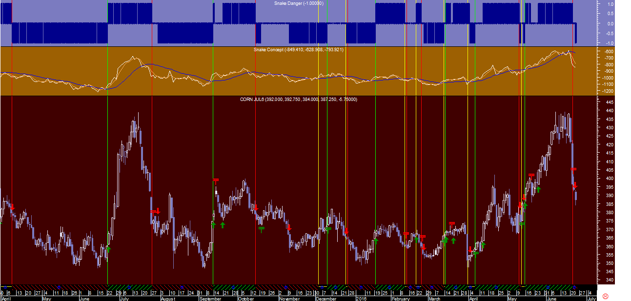 A volatilidade está abusadoramente elevada no Milho, o que pode ser facilmente detetado no gráfico dos indicadores através da diferença no afastamento entre o indicador branco e o azul.