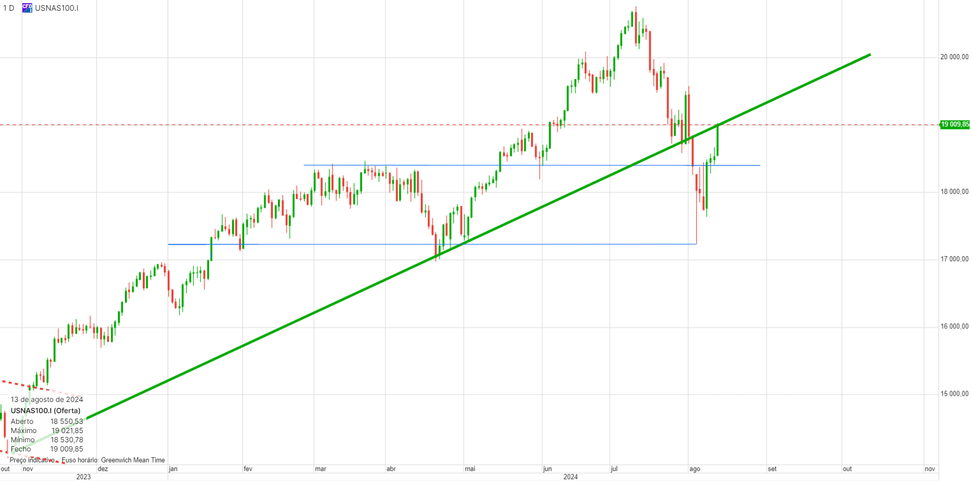 Longo até aos 19300, onde a linha descendente a azul está a limitar o preço.