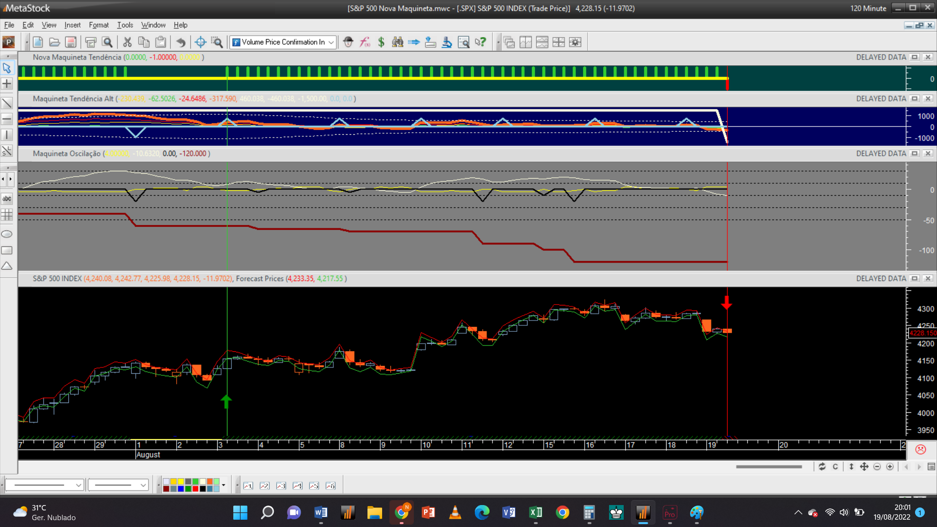 A escala horária acaba também por disparar uma ordem de compra oscilatória às 18h 20m, abrindo uma nova posição longa ao preço limite de 4237 Usd / contrato., corrigindo assim uma ordem idêntica que não foi atingida há 2 dias atrás.