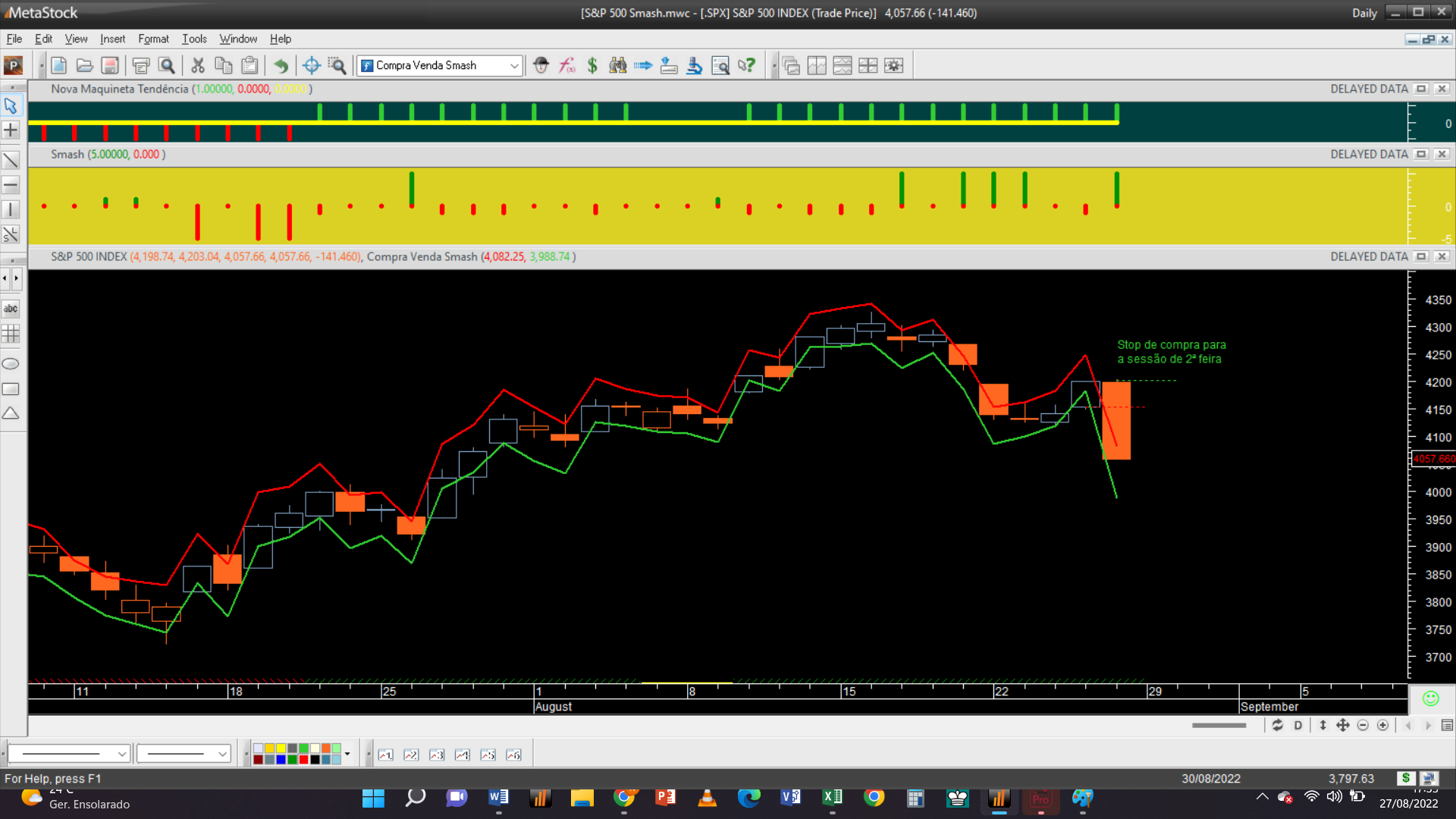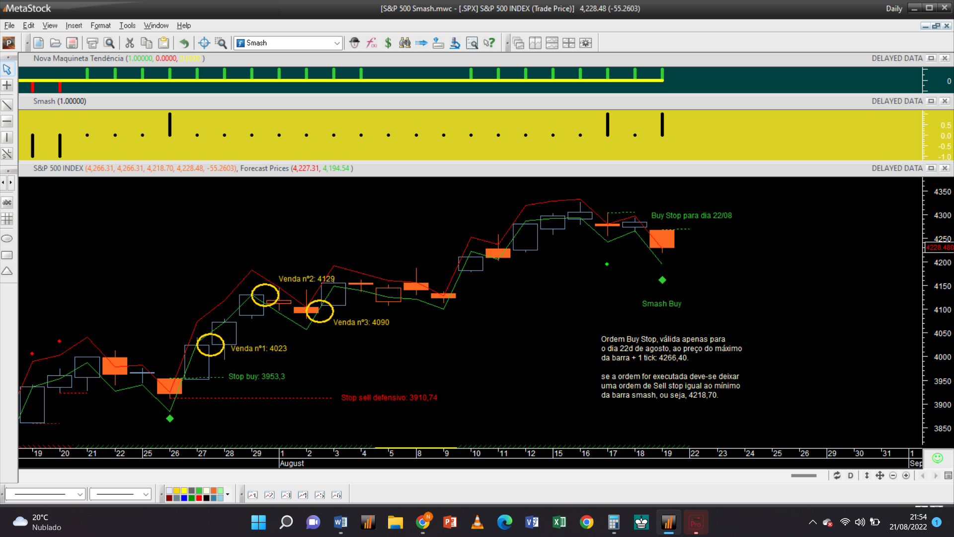 Deixo abaixo o gráfico diário do S&P 500, com o simples sistema que deteta barras “smash”, onde curiosamente ocorreu uma barra “smash buy” na passada 6ª feira e um exemplo dum conjunto das 3 trades na última barra de “smash buy” do passado dia 26 de julho em que resultou uma compra de ordem stop, ocorrida na barra seguinte e a forma como os 3 lotes de contratos comprados foram despachados.