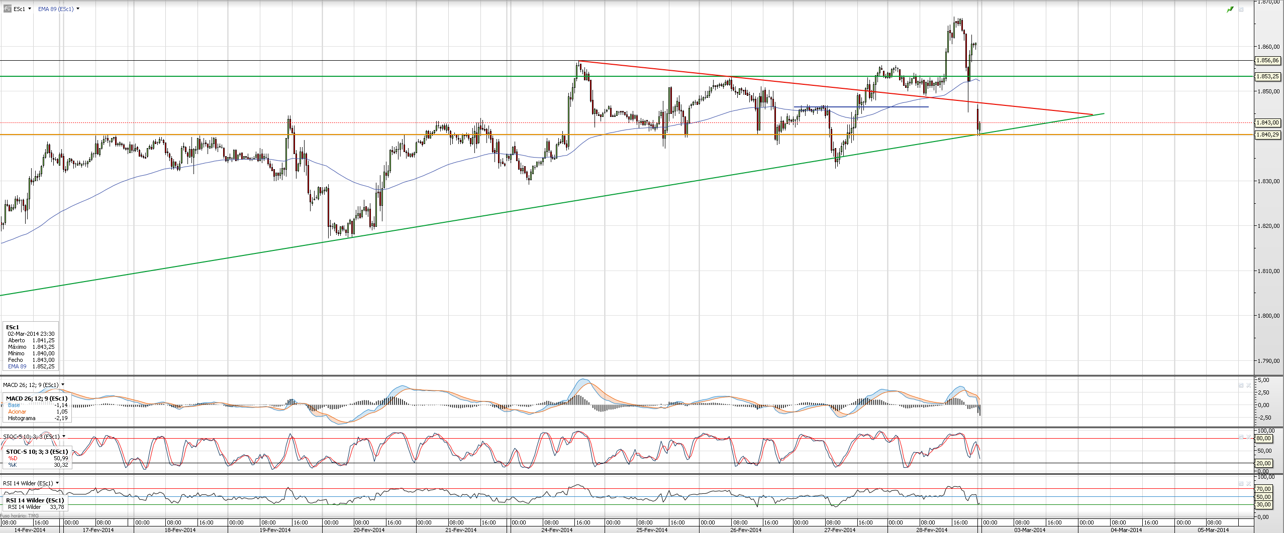O ES continua a circular dentro da Wedge, o que pode ser bom como previsão para o movimento do dia. Apesar do DAX ter aberto em baixa, não passou dos 9500 no primeiro movimento de descida, e pode tentar a recuperação.