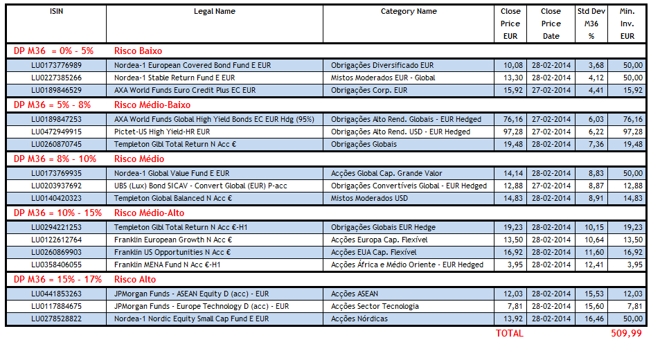 E perante o desafio do Sr. Chico, fiz uma carteira mais barata do que a carteira dele, menos 3,27 EUR, e adicionei mais 1 fundo a carteira. Acabei por fazer uma carteira de fundos diversificada por zonas geográficas.