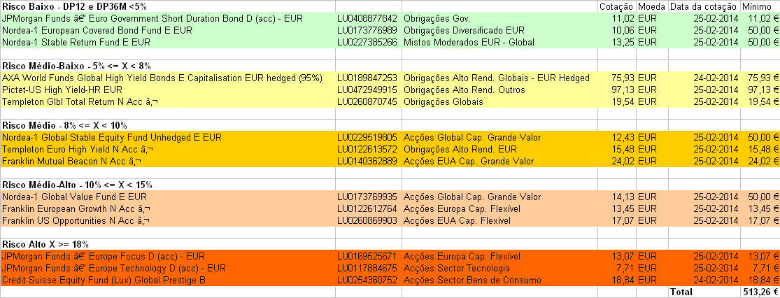 (Estava para apresentar os fundos através de uma imagem do meu excel, contudo na minha opinião é mais prático ter plain text de modo a permitir copy paste)