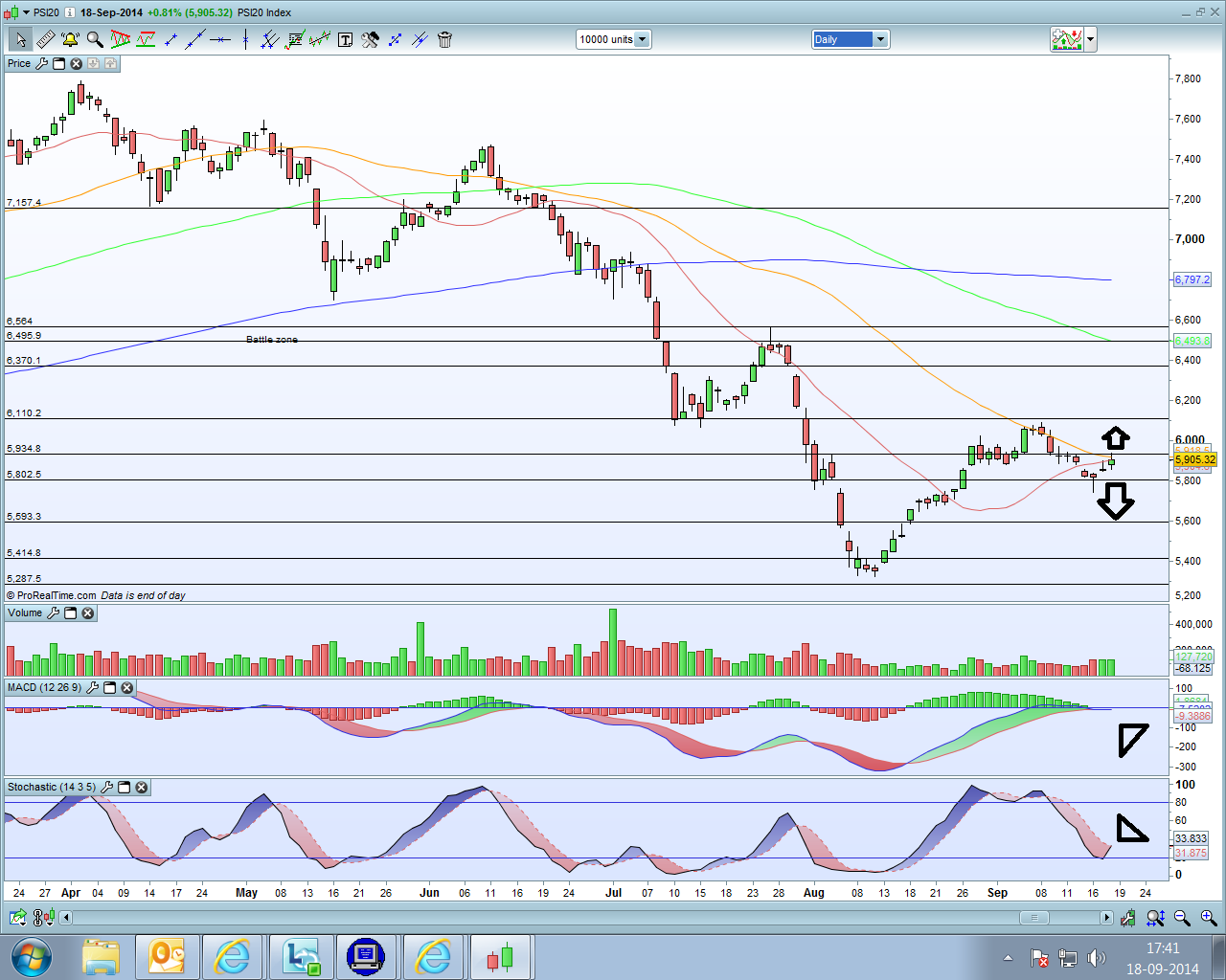 Fez 3 fechos a subir...apesar de nao serem velas bonitas... é sempre bom...estocastico a começar a inverter apos chegar a oversold!!!!! Confesso que hoje tava a espera de uma sessao calma...tudo à espera dos escoceses...mas afinal nao...a diferenca é que no final...os tugas nao quiserem levar as cenas para casa...