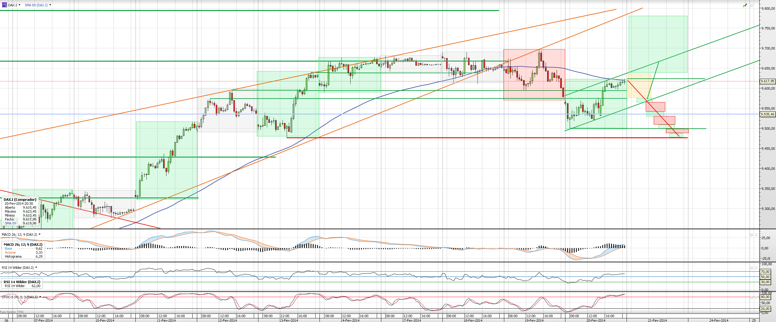 - - Basicamente amanhã não quero entrar curto (apesar de < 9590 ser tentador se for no inicio da sessão, tudo dependente da distância de pontos para a base do canal), mas quem for nesse sentido, vejo como profit targets a equacionar, os quadrados verdes abaixo do canal verde