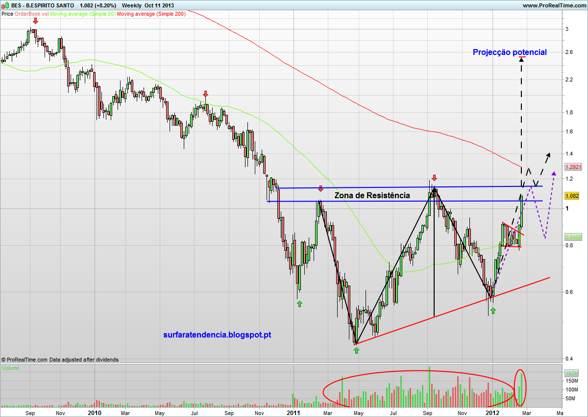 O banco BES foi, uma vez mais, o vencedor da análise semanal! Esta procura pelas análises ao BES, que vence todas as sondagens em que entra, é por si só representativa do interesse que tem rondado o título nos últimos meses. E se eu estava já com um outlook muito positivo na última análise, o meu optimismo sai redobrado após as duas últimas semanas e respectivas subidas combinadas na ordem dos 30%! Farei uma vez mais a análise no gráfico semanal, para manter a congruência com a anterior.