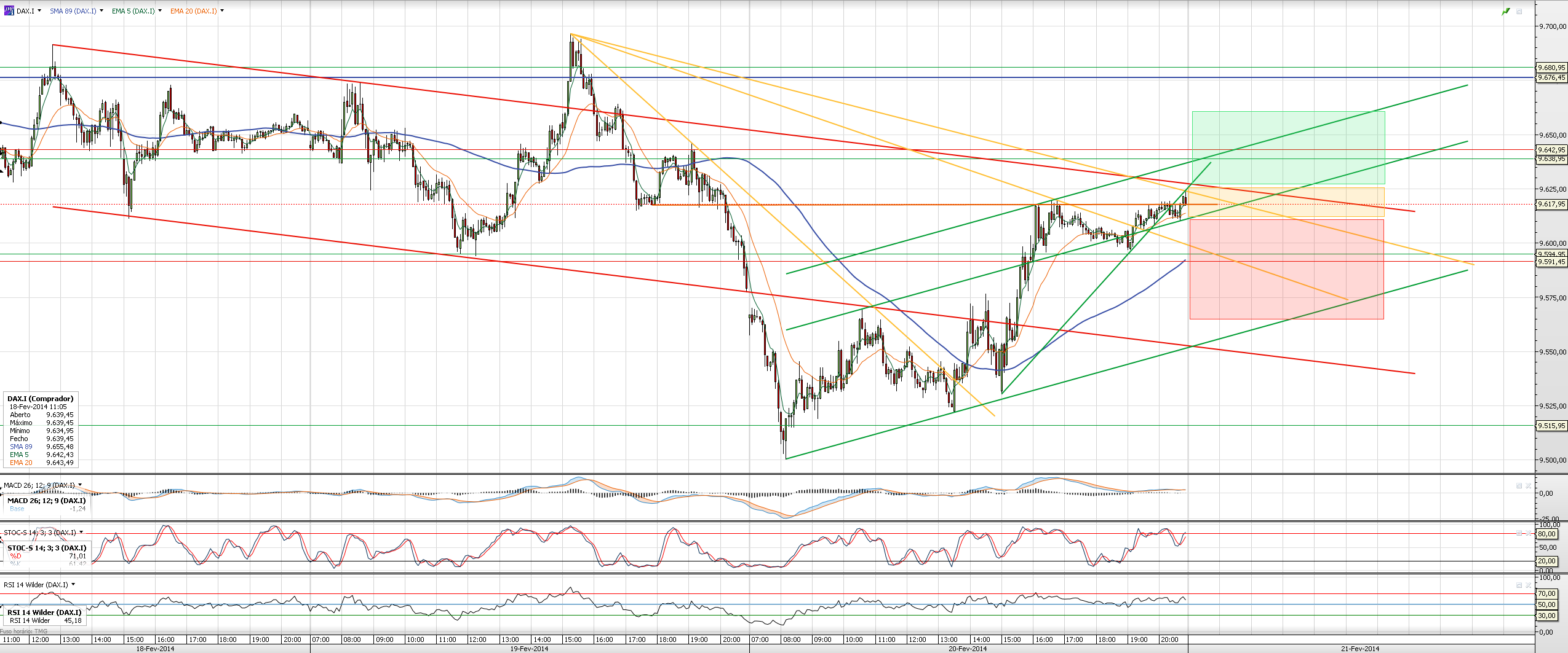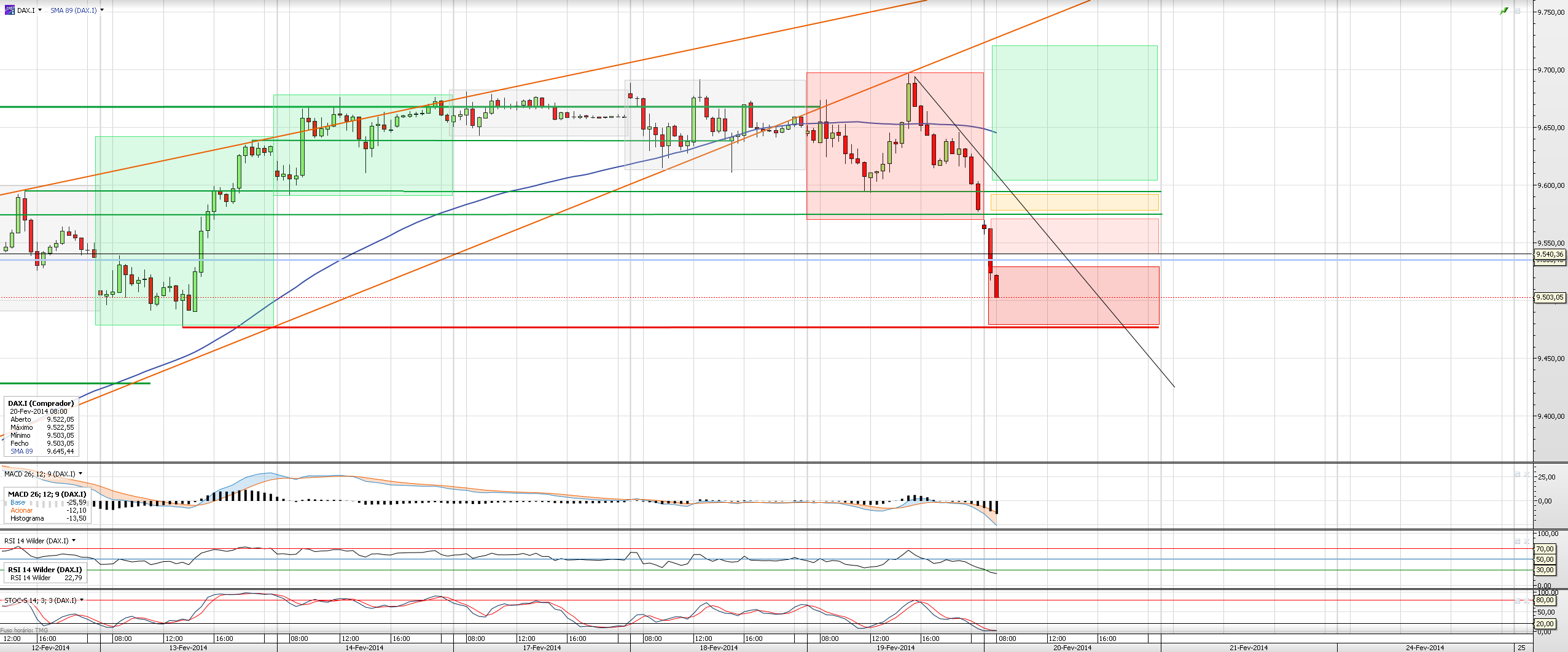 - - Basicamente amanhã não quero entrar curto (apesar de < 9590 ser tentador se for no inicio da sessão, tudo dependente da distância de pontos para a base do canal), mas quem for nesse sentido, vejo como profit targets a equacionar, os quadrados verdes abaixo do canal verde