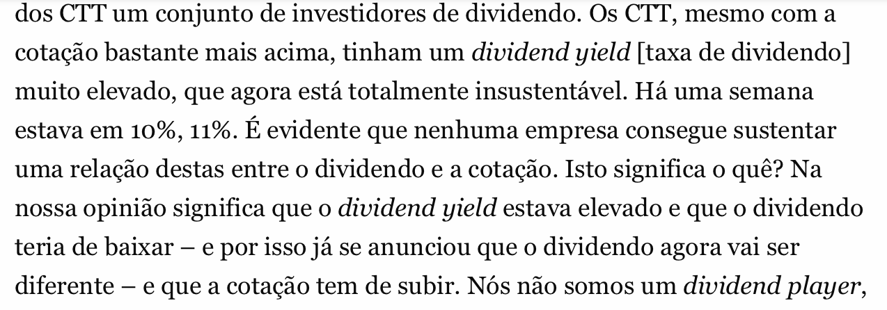 Os CTT, mesmo com a cotação bastante mais acima, tinham um dividend yield [taxa de dividendo] muito elevado, que agora está totalmente insustentável. Há uma semana estava em 10%, 11%. É evidente que nenhuma empresa consegue sustentar uma relação destas entre o dividendo e a cotação. Isto significa o quê? Na nossa opinião significa que o dividend yield estava elevado e que o dividendo teria de baixar – e por isso já se anunciou que o dividendo agora vai ser diferente – e que a cotação tem de subir.