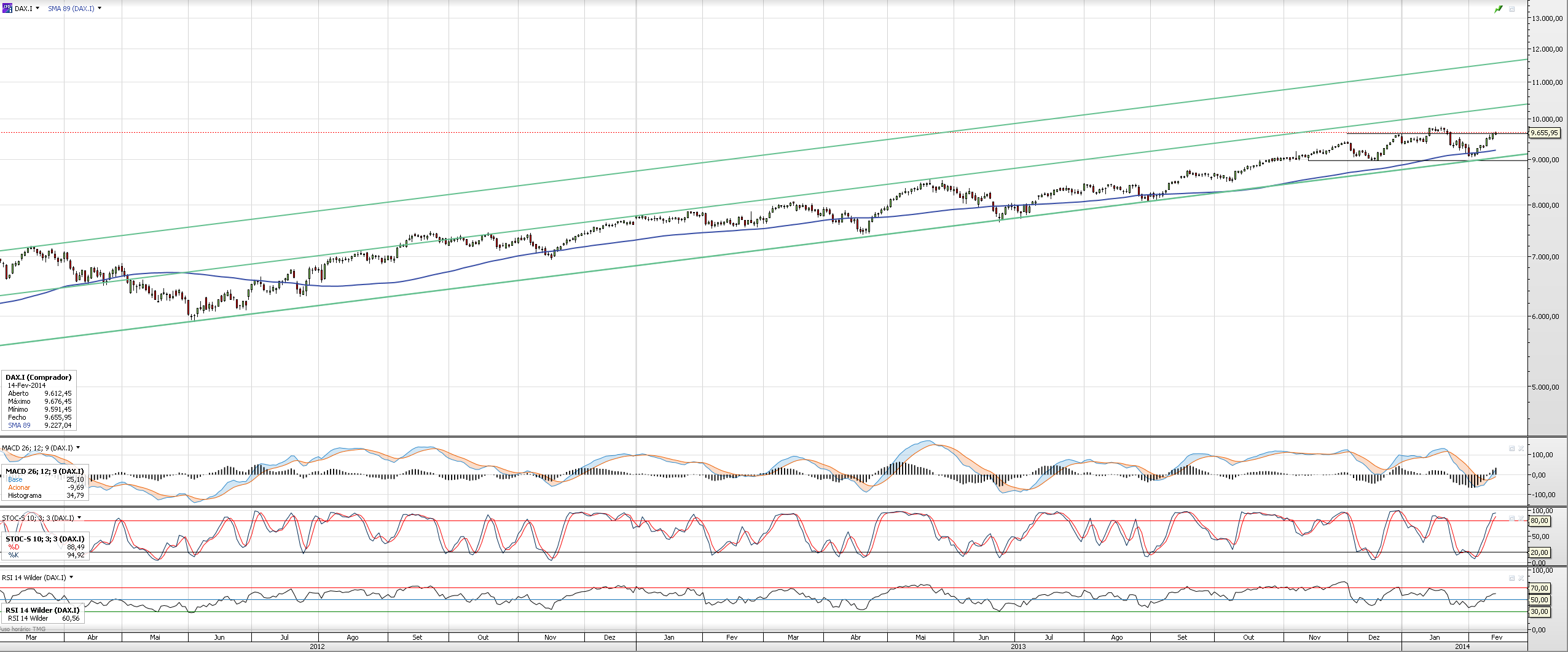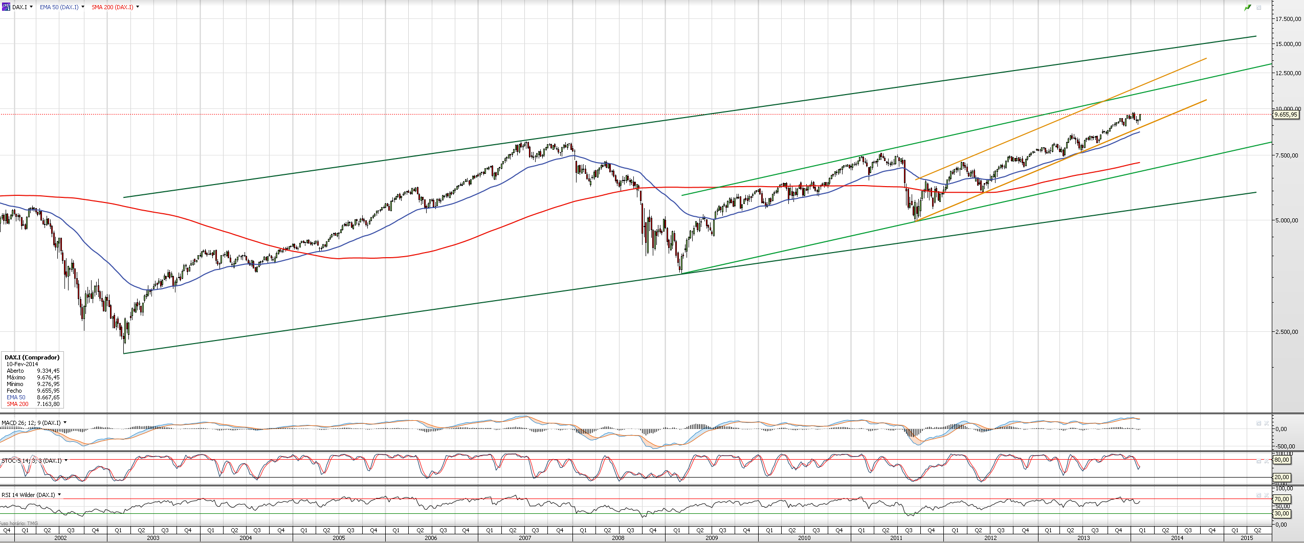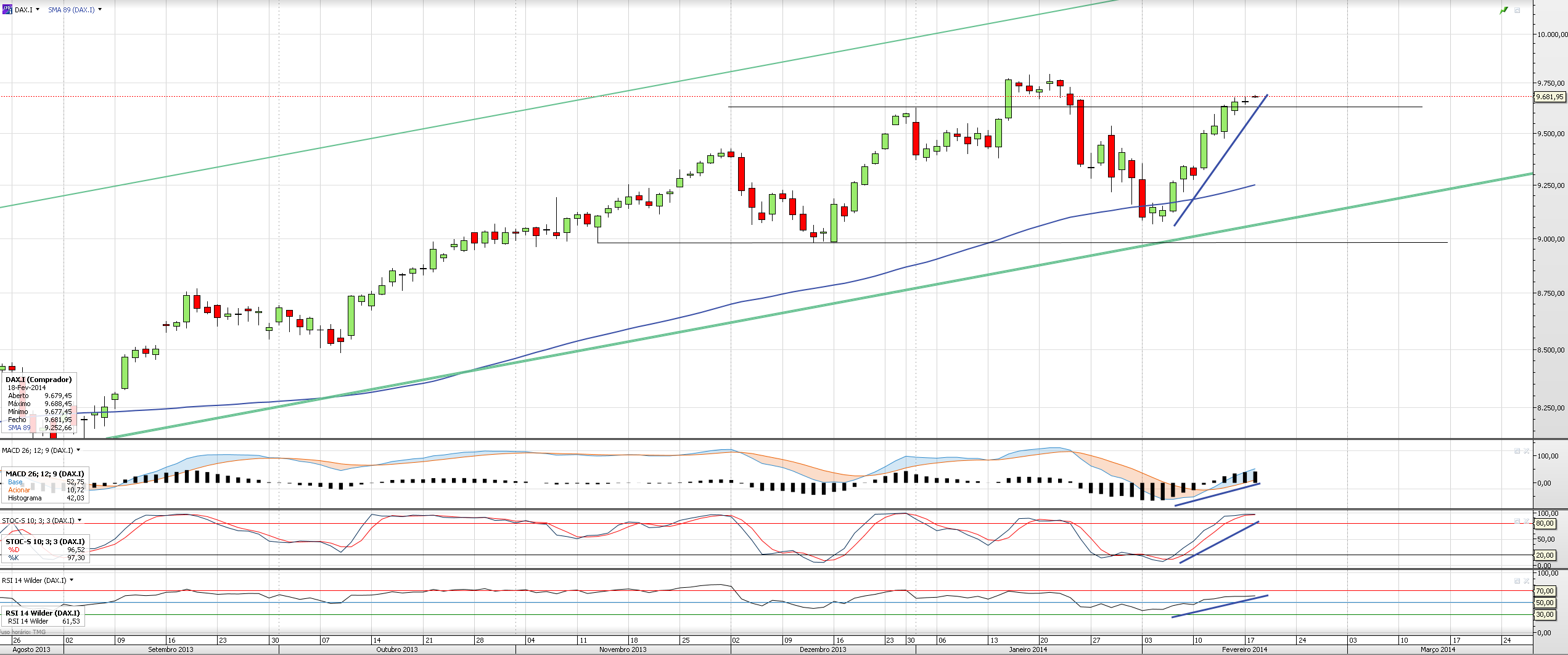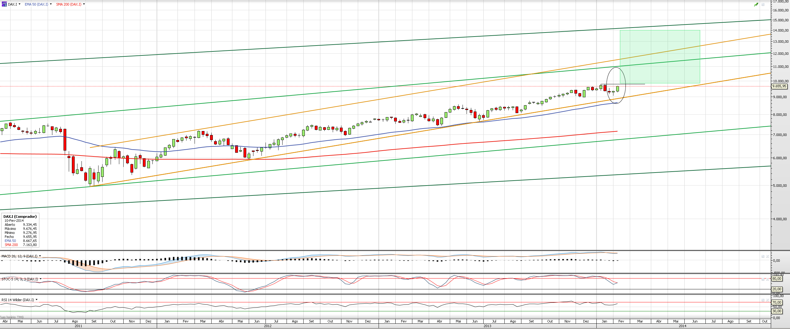 Mas nota-se que a força do DAX nesta última onda parece fraquinha, comparando com o ano de 2013, onde os higher lows tinham uma diferença de 200pts, este a formar-se, está em risco de ser menos de 100pts.