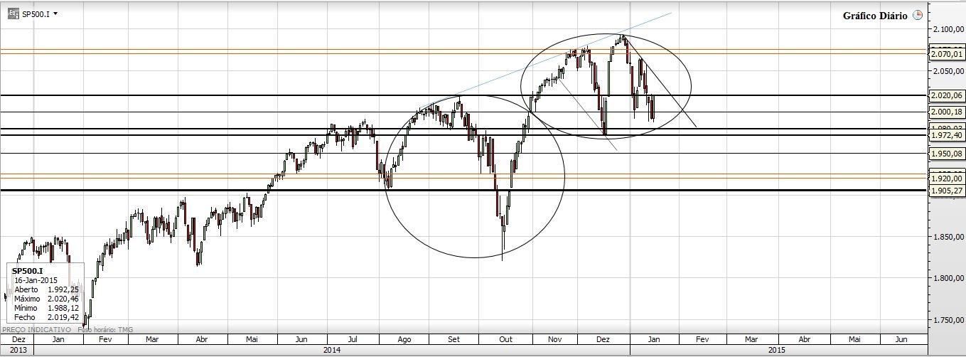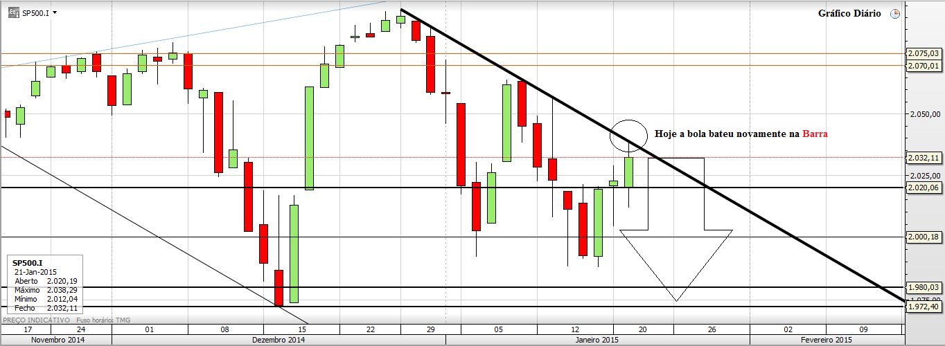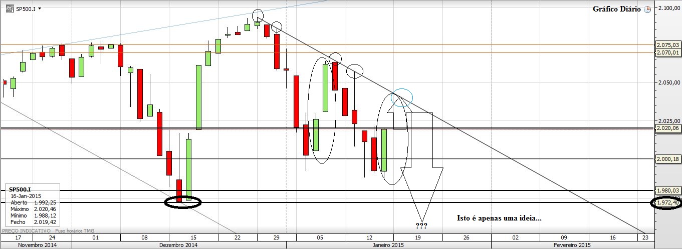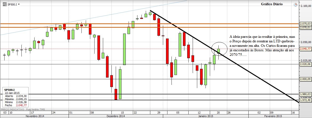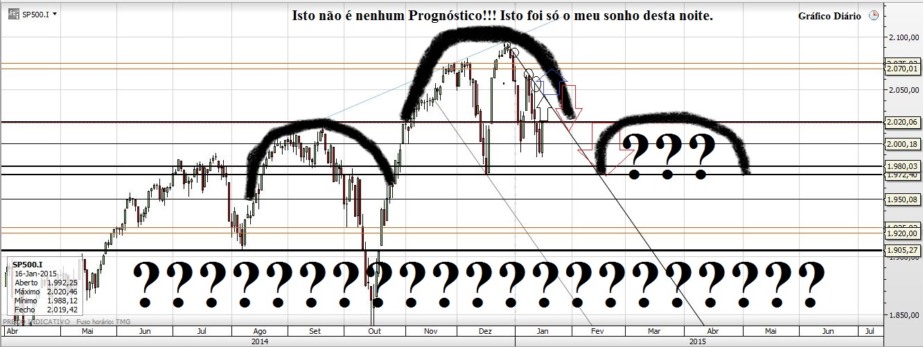 Olhemos para o gráfico em baixo, vamos supor que o Preço não passa aquela pequenita LTD, se assim for estará a fazer novamente máximos mais baixos, tendo já feito na última sessão um mínimo mais baixo do que os de 6 e 14 de Janeiro. Se isto acontecer, e na sequência, é bem possível que um novo mínimo relativo seja feito. Este cenário é perfeitamente razoável. Se assim for e se se verificar que o que vai acontecer é uma nova ida até lá abaixo, então, na fotografia, o que se deverá começar a observar é um Topo arredondado com um Máximo de sempre, do lado esquerdo também se pode ver já um Topo arredondado, mas mais baixo e do lado direito poder-se-á "imaginar" qualquer coisa como por exemplo um Topo arredondado também mais baixo... Trata-se de um cenário razoável, e sim, porque não colocar esta possibilidade de figura com um cabeça nos máximos de sempre?... Para que esta situação acontecesse seria bom que o Preço não passasse os 2070/75 e que fizesse num horizonte de curto prazo um mínimo mais baixo que o de 16 de Dezembro.