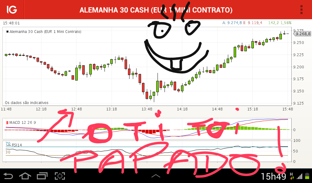 Entrei curto nos 9210 antes do Draghi ter iniciado a palestra, vi um duplo topo e não quis deixar de aproveitar, já que o anuncio da taxa trouxe sentimento curto, acreditei que a palestra fosse igual. Já coloquei stop nos 9199, logo profit está garantido, é deixar correr onde isto vai. A previsão do dia para curto pode estar a tomar sentido, mas ainda vamos no inicio do dia nos US, vamos ver onde acabamos!.