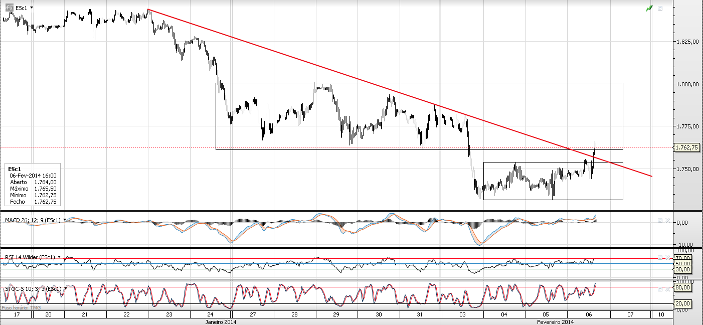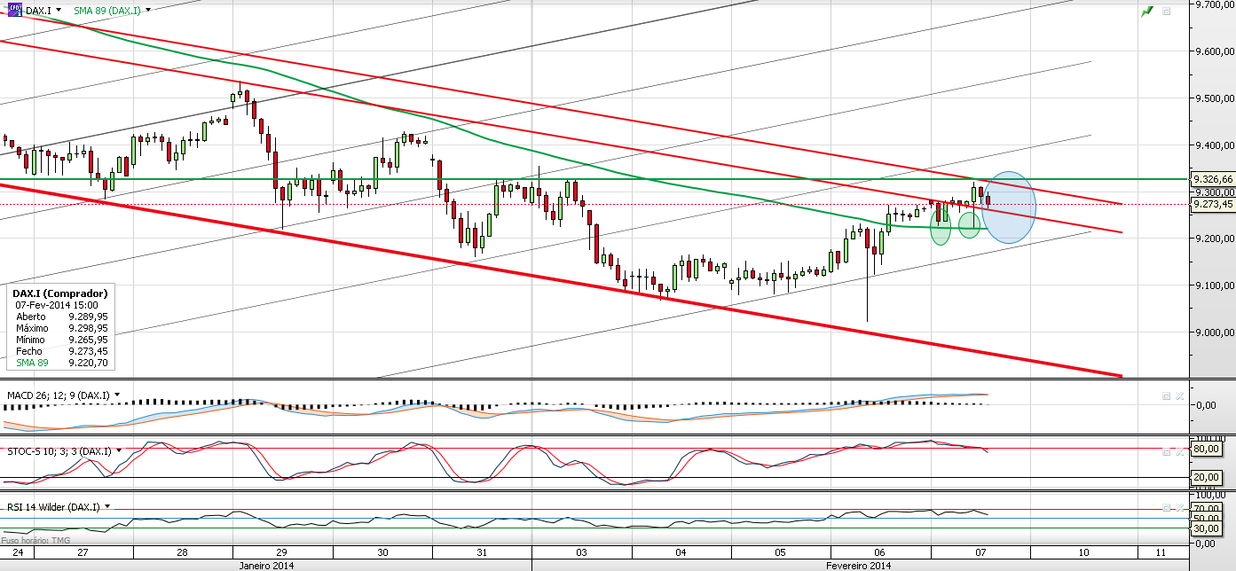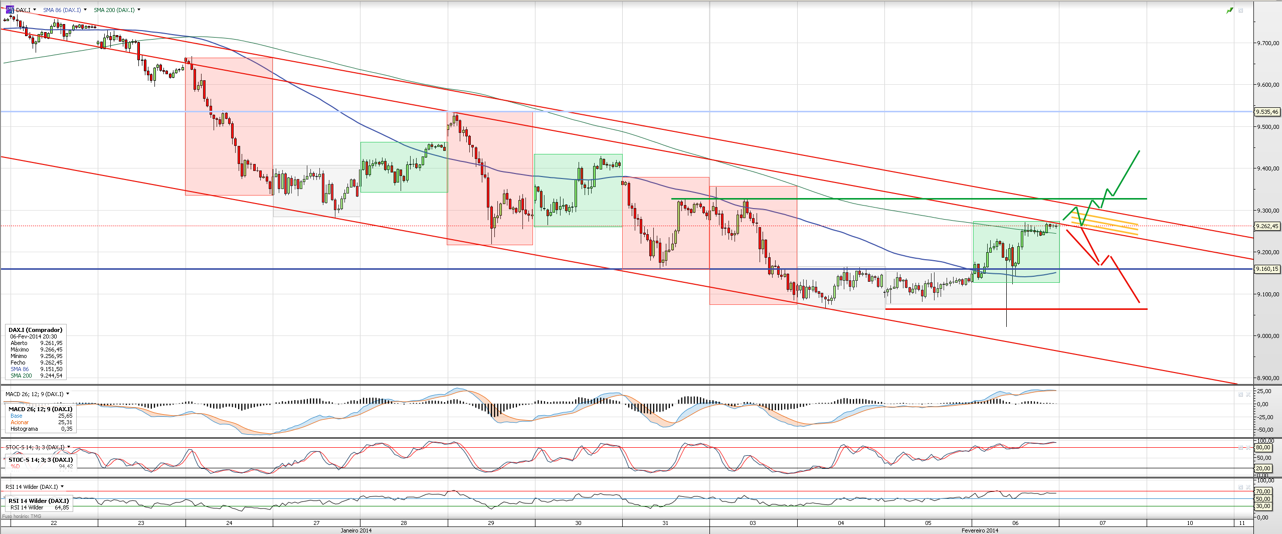 - Vejo possivelmente muita resistência em passar o range 9280-9330 porque entre dia 29 de Janeiro e 3 de Fevereiro temos muitas barras de consolidação nesse range. Basta traçarem um rectângulo nesse range de 29 de Janeiro até hoje e verão o que digo.