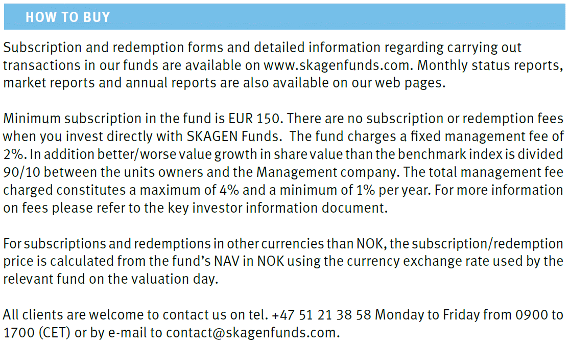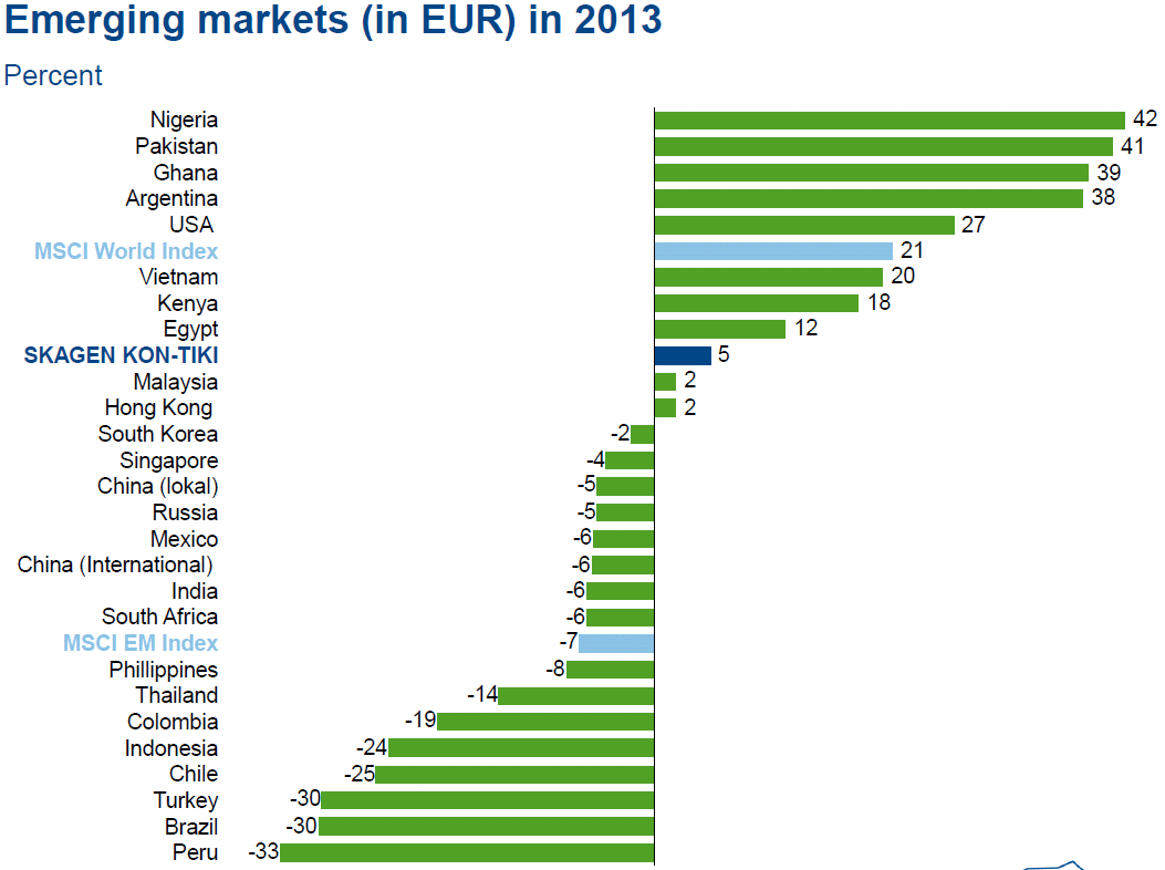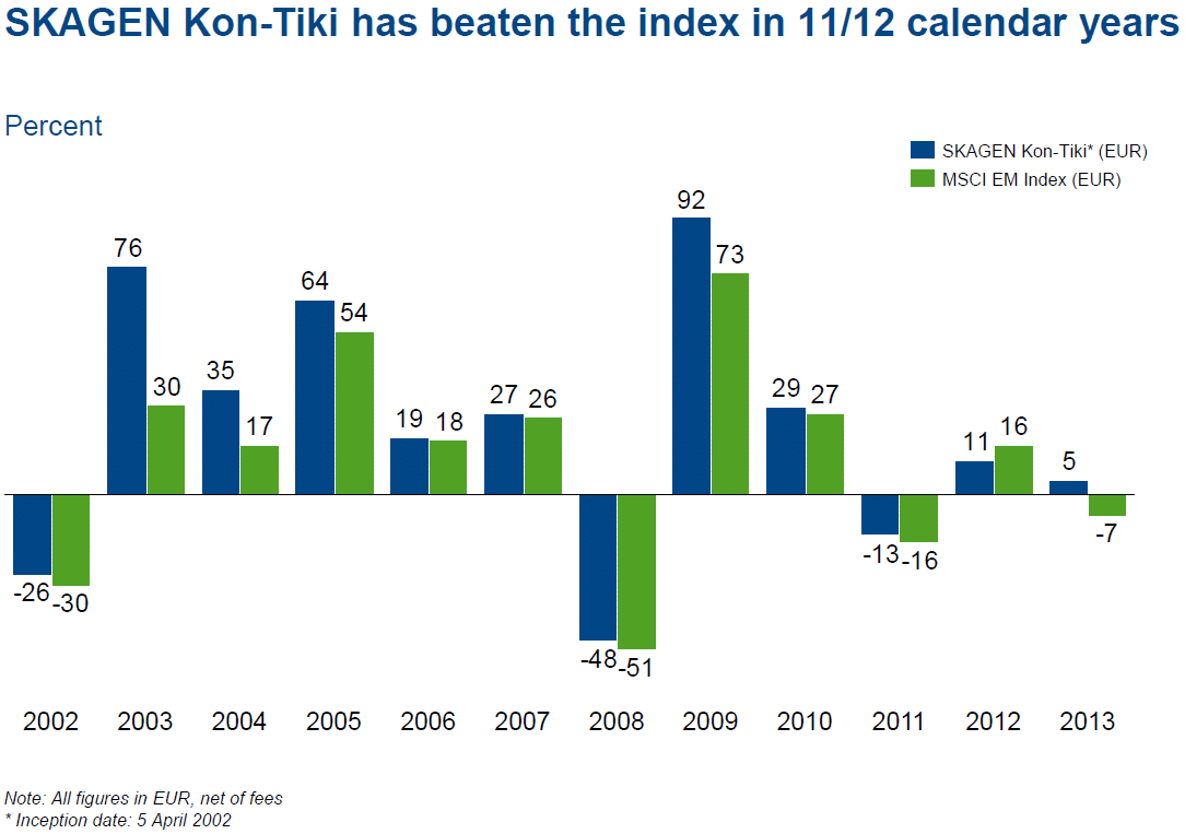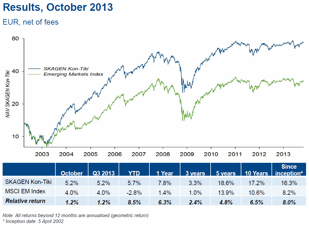 As últimas informações do fundo SKAGEN Kon-Tiki A (NO0010140502), de 31/Dezembro/2013, fechando o ano de 2013: