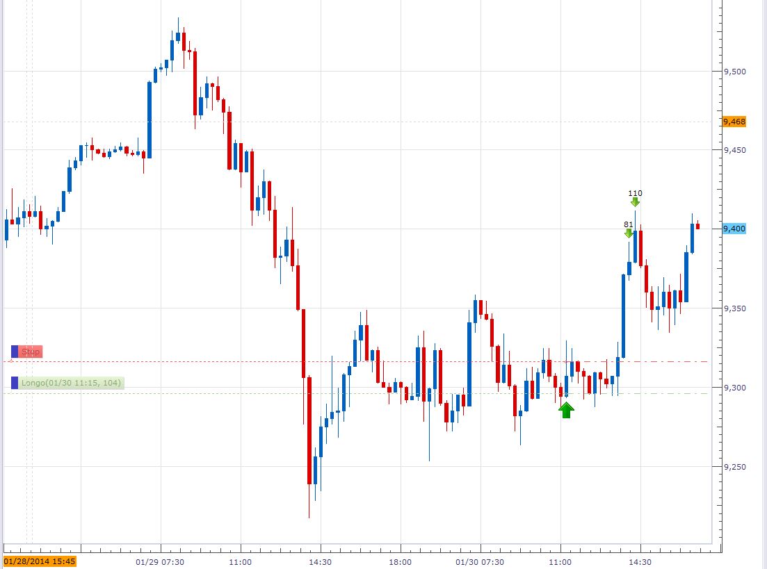 farracha,entrada longa em fecho acima dos 9400 e retirada (stop loss) em quebra dos 9400.