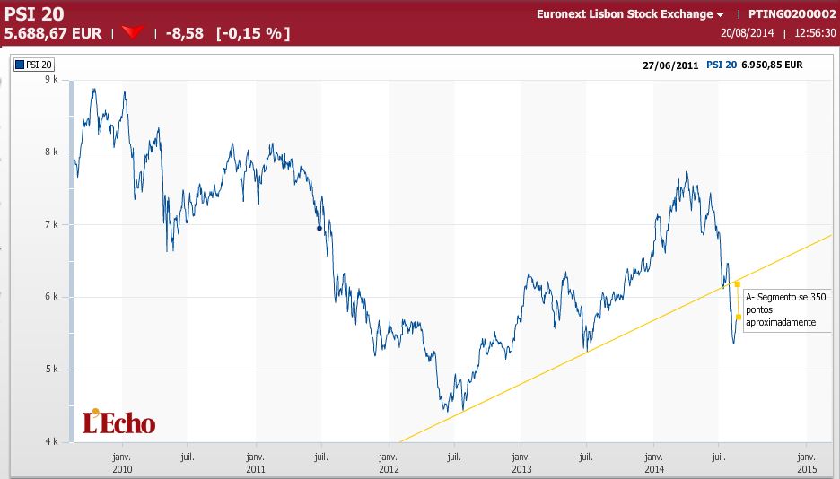O risco que anexo tenta ilustrar (coitadito) de alguma forma, o efeito do 'caso BES' no índice e a falibilidade de quem considera a LTA quebrada. Procura, ainda que miseravelmente, justificar os meus posts anteriores quanto à forma como devemos ler (e talvez alterar) os cinco mil seicentos e tal pontos que atribuímos ao PSI 20. Dito isto, tomo coragem para afirmar o disparate: devemos considerar em at apenas o psi 18 ou manter os valores do BES iguais àqueles que tinha em fevereiro, ou coisa que o valha.