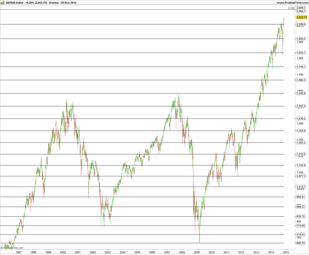 ricardmag Escreveu:Mensagem por ricardmag » 13 nov 2014, 21:04A minha previsão é que durante a próxima semana o SP500 venha visitar a EMA20 perto dos 2000