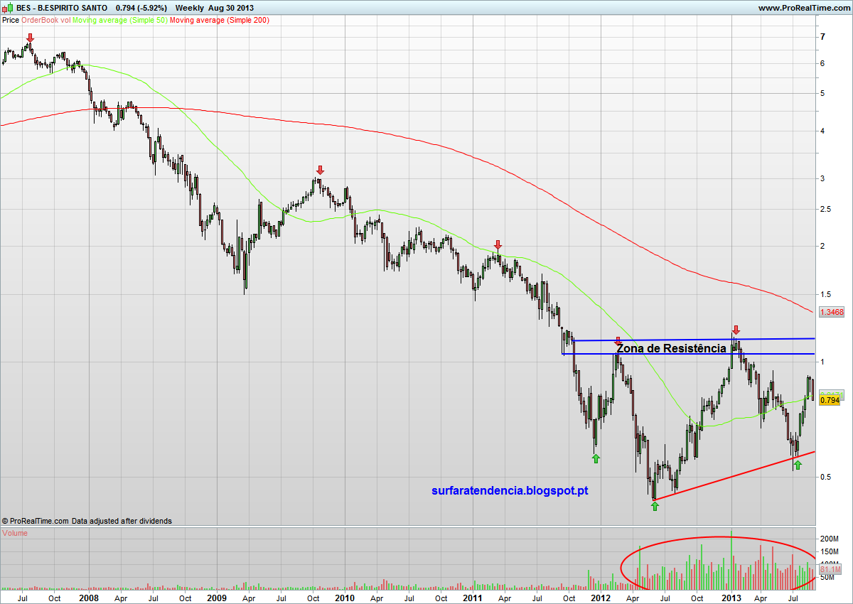 Não pretendendo fazer juízos de valor sobre os trades que cada um adopta, queria apenas sublinhar que estes devem-se apoiar em estratégias e elementos muito bem definidos. O BES é um exemplo de como às vezes somos levados pelo momento. Na semana passada, devido às descidas, tínhamos análises que apontavam para sul com ida até ao suporte dos 0.75. Hoje está a subir e já falam nos 0.90.