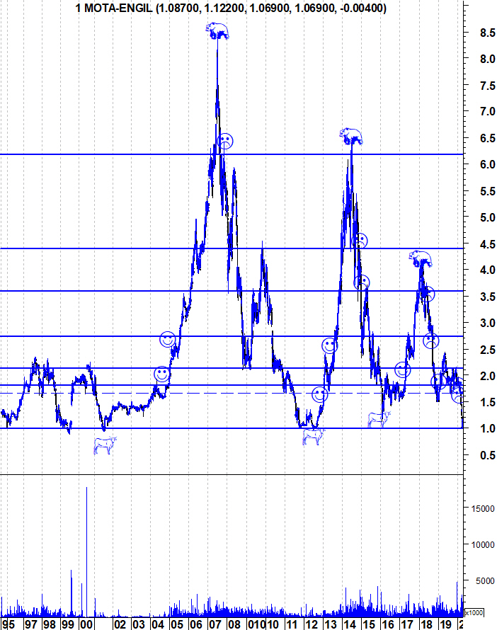 Aqui deixo os gráficos actualizados da Mota. Deixo o gráfico de longo prazo para verem quão importante tem sido aquela zona de suporte ao longo da história da empresa em Bolsa.