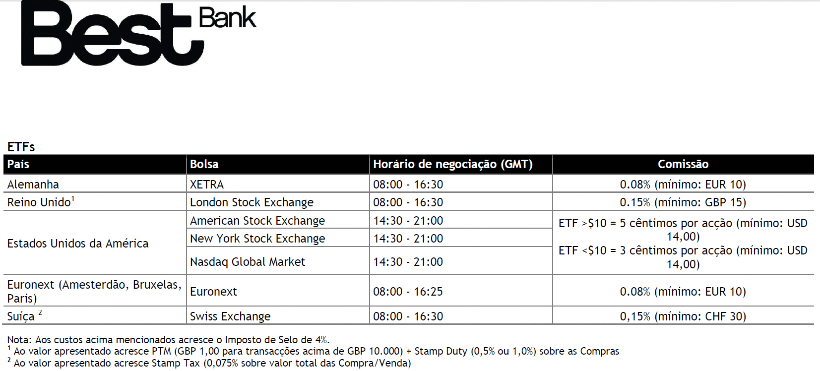 Imagem do preçário de ETFs na plataforma do SaxoBank, utilizada pelo Banco Best: