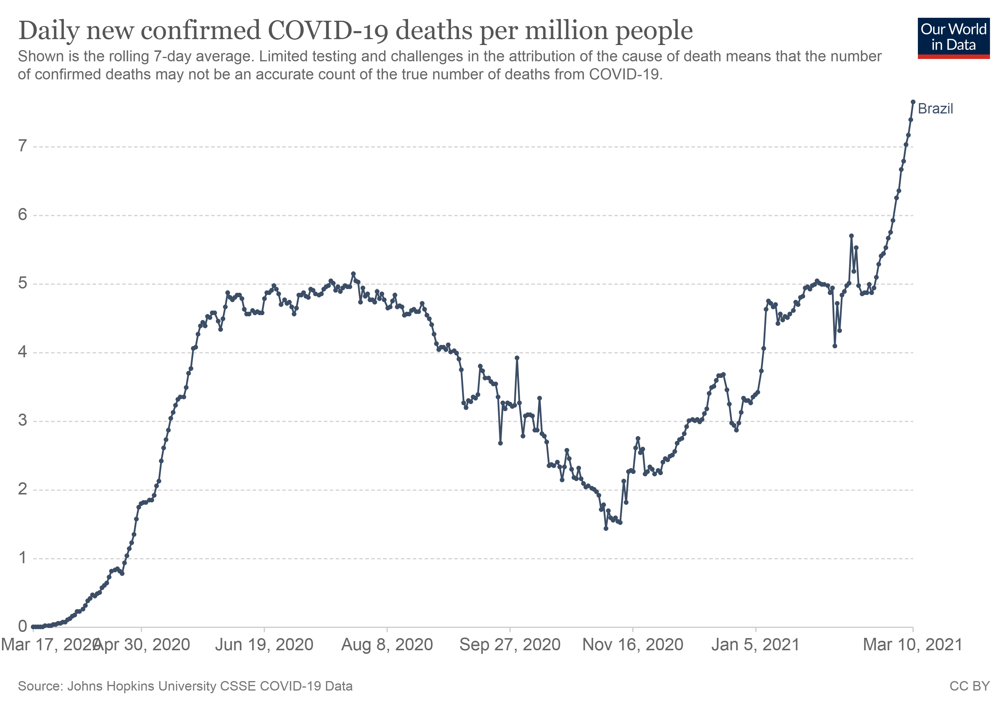 Terceiro, como é que foi possível em 18 dias do mês de março (Verão), o Brasil ter chegado (infelizmente) a este registo como já sendo o pior mês da Pandemia? Na verdade a curva de nº de casos e mortalidade já vem muito inclinada e já superou os valores do inverno passado, lá tenho que repetir : foi a "vaga de frio" que anda aí...