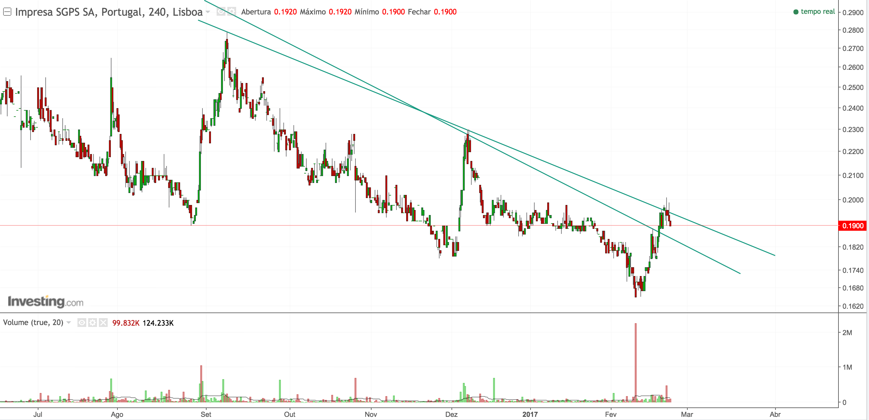 Terá de fechar acima de 0.18 com volume para acreditar que vai a 0.20. O problema é perceber quando é que a Impresa dá lucro! Será no próximo trimestre? E, se não fossem as telenovelas a SIC teria um futuro ainda mais negro. As telenovelas é que parecem estar para lavar e durar apesar da forte concorrência da Tvi. E o Expresso que ainda vende. A Visão é para esquecer, quem compra uma revista acima de 3 euros que tem o conteúdo todo on line grátis durante a semana seguinte? A Visão e a Sábado ou mudam ou ficam todas na prateleira. Talvez a CGD, agora que é pública, salve a SIC de problemas maiores. Sim porque aquela dívida só com uma boa reestruturação se aguentará.
