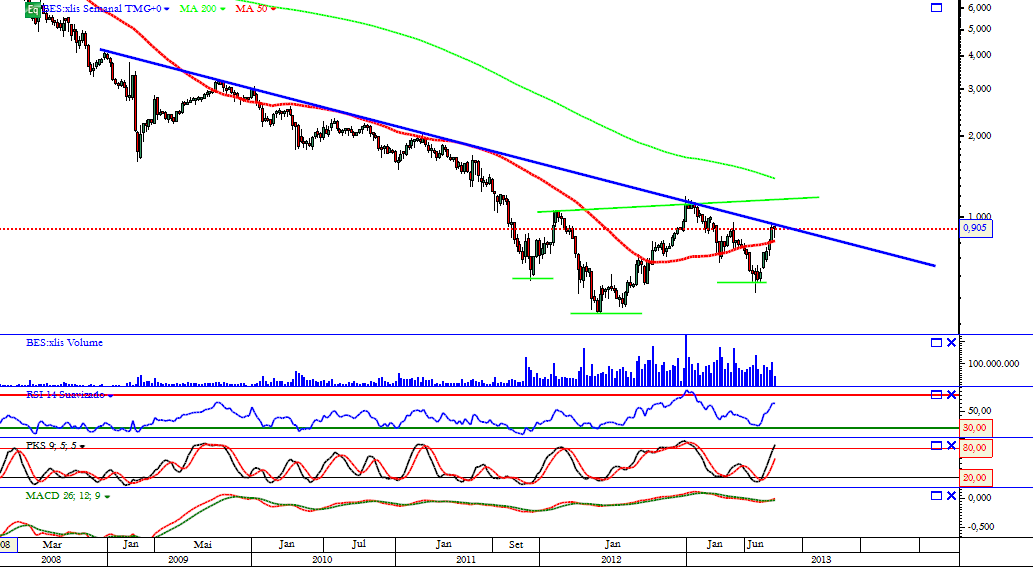 Qual parece ser agora a grande resistência do BES? Os 0,92€ de 15 de Agosto ou os 0,95€ de Maio? Bem sei que primeiro terá de passar pelos 0,92 para chegar aos 0,95, mas gostava de saber opiniões acerca da força das próximas resistências.