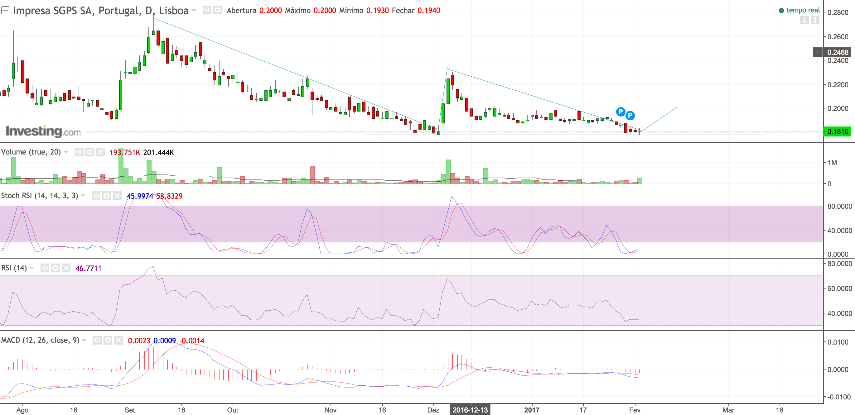 Pelo lado negativo, se for abaixo da linha a vermelho a operação é fechada, apesar de acreditar que será um fecho errado (pelo valor irrisório que o mercado atribui à impresa) mas é o que tenho definido.